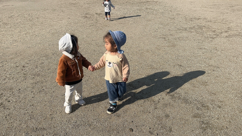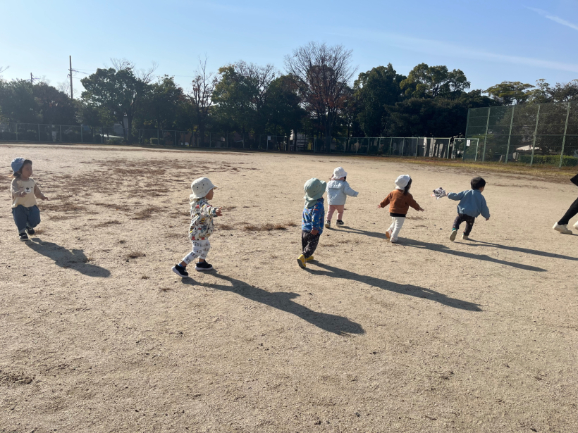 保育者と追いかけっこ、かくれんぼをして体を動かすことを楽しんでいます。