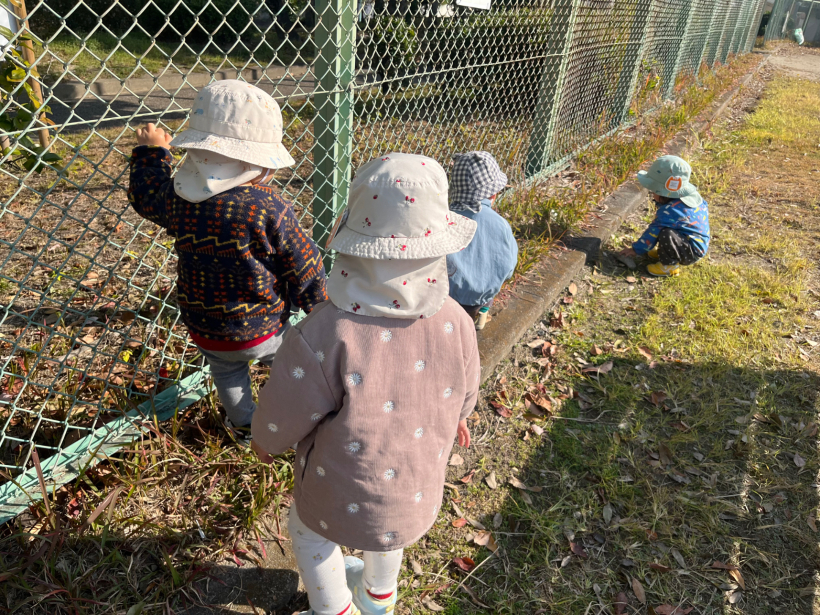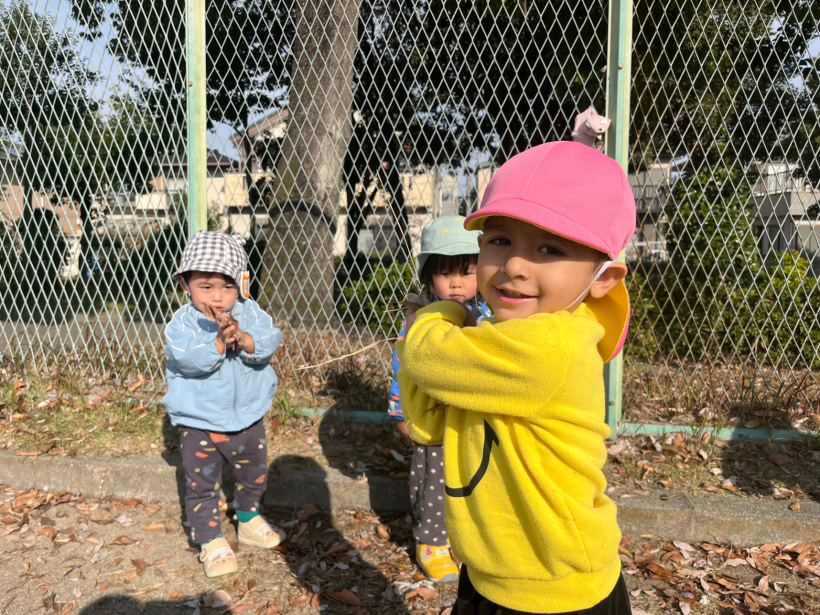 寒さに負けず近隣の公園へ散歩に行くと落ち葉を集め、足踏みをして感触遊びをしたり、