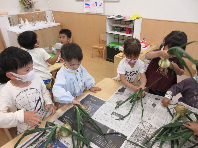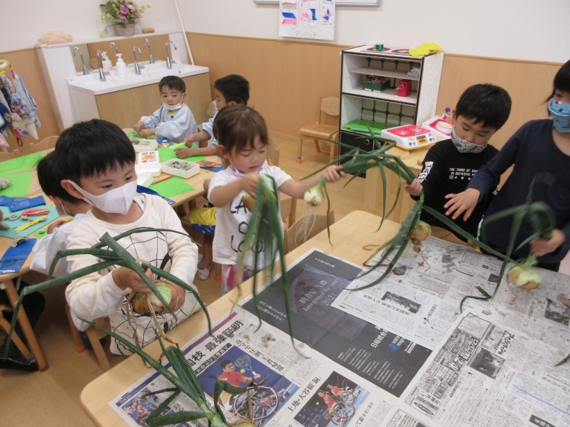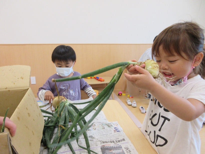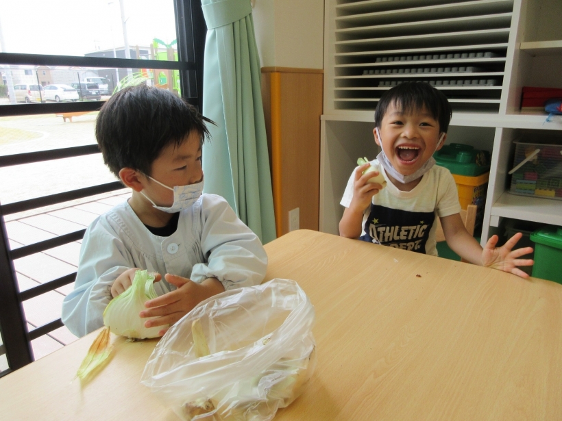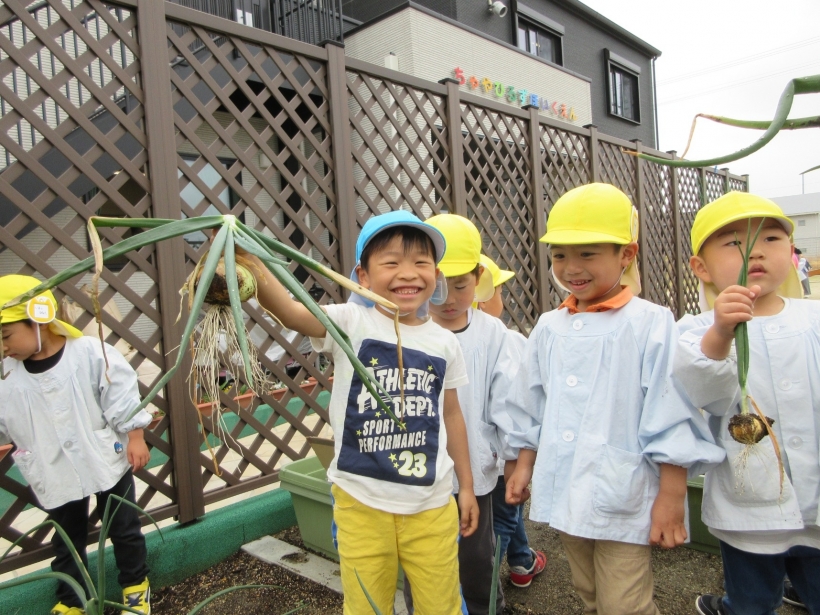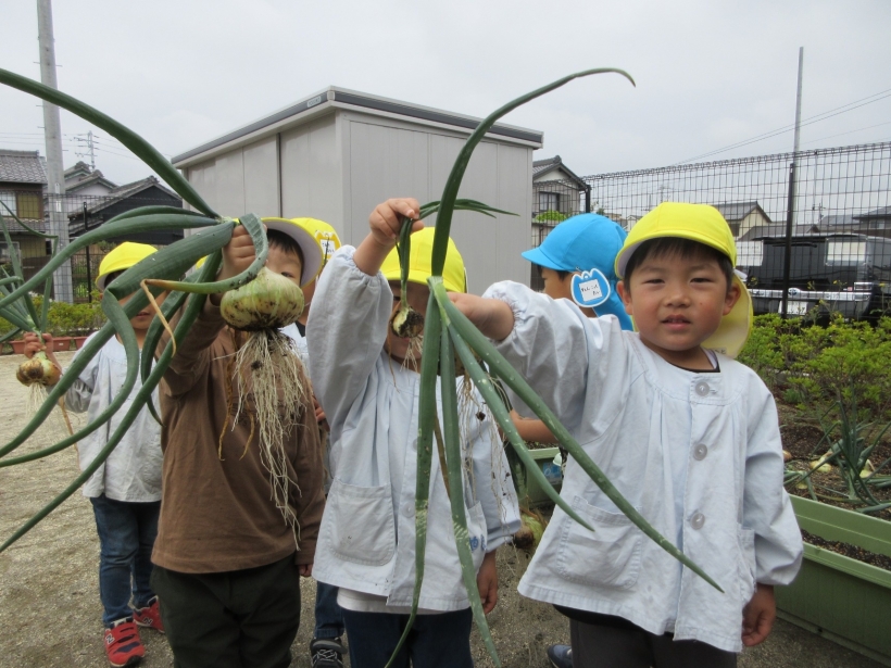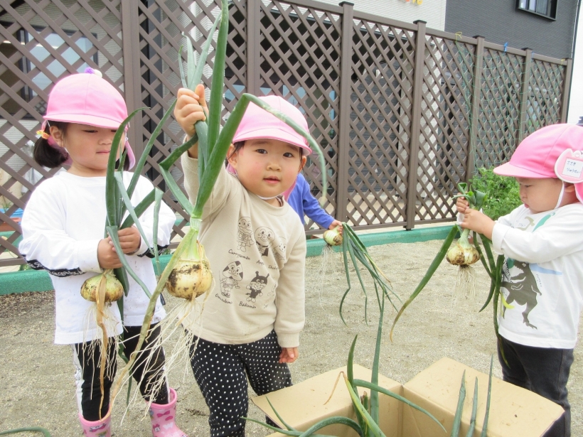 保育園の畑で大きくなった玉ねぎを収穫したよ。
