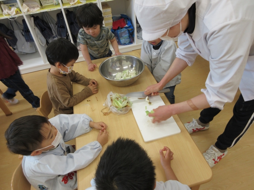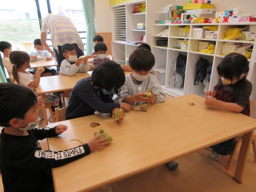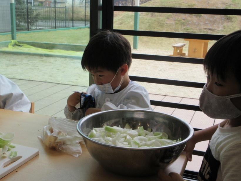 子どもたちは収穫、皮むきをしました。スープができるまでの工程を五感で感じながら体験しました。