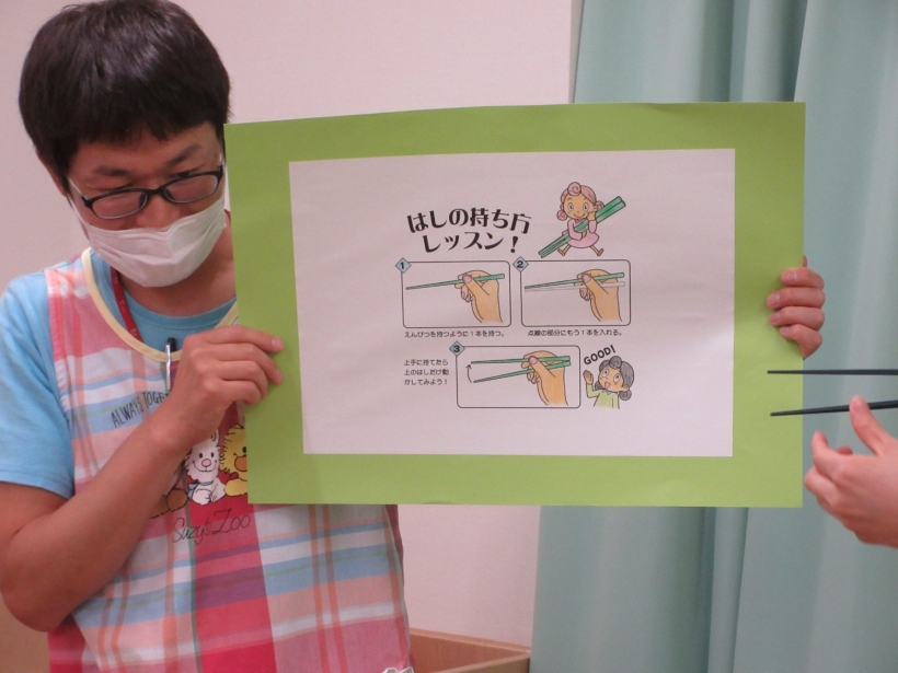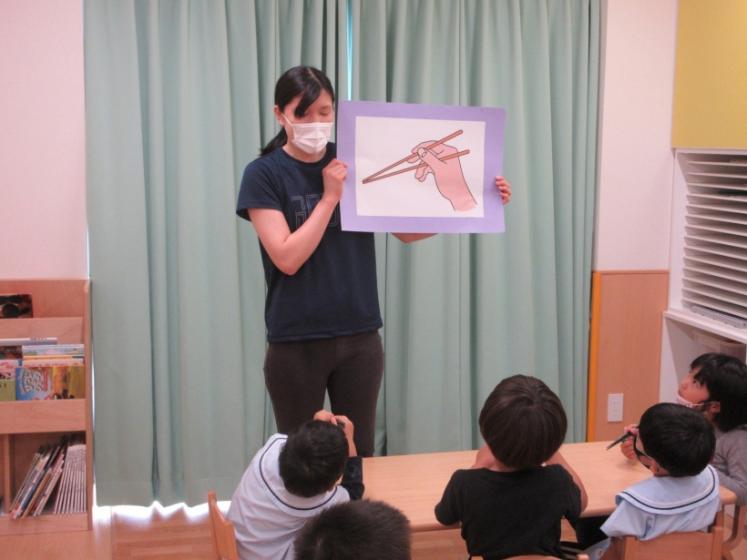 箸の正しい持ち方を給食の先生に教えてもらいました。