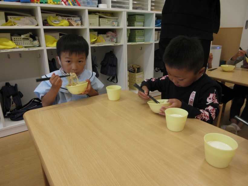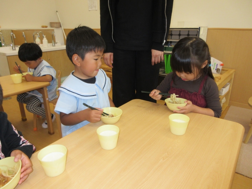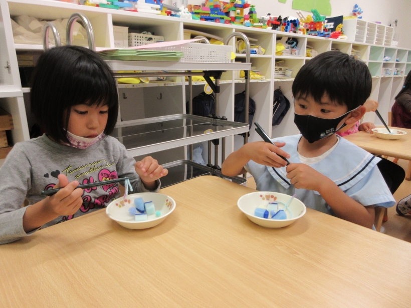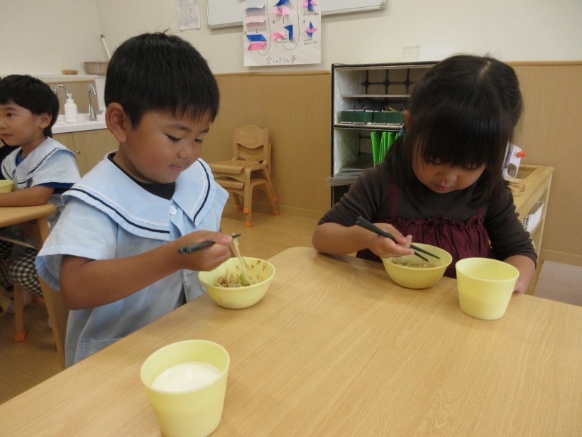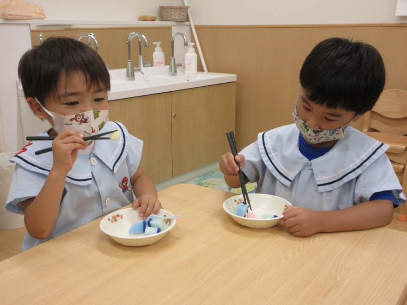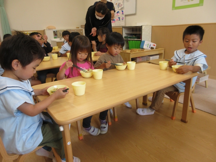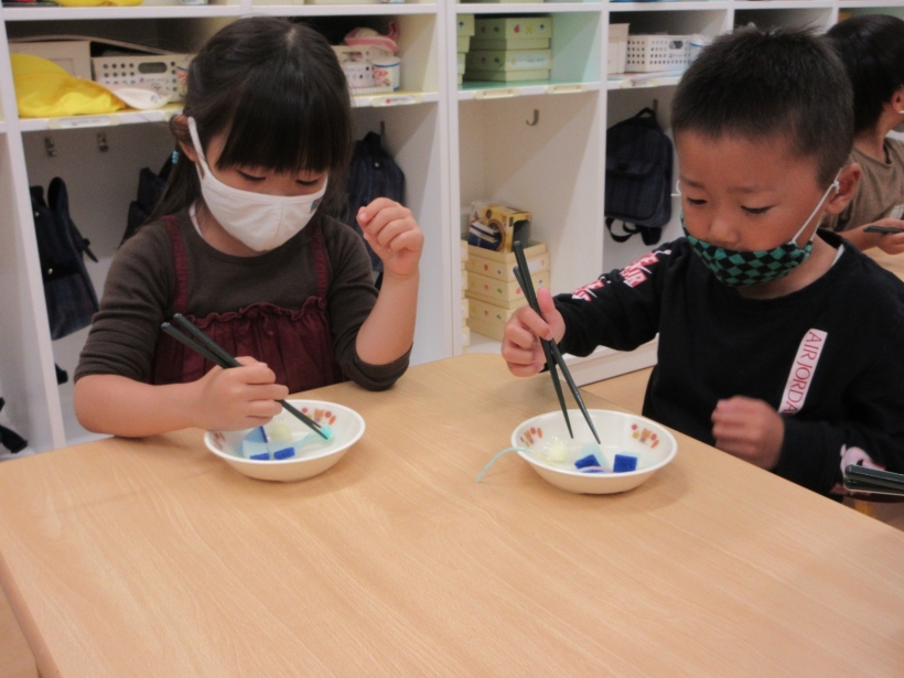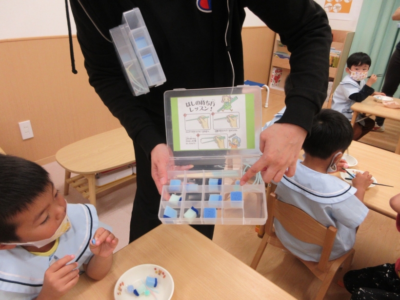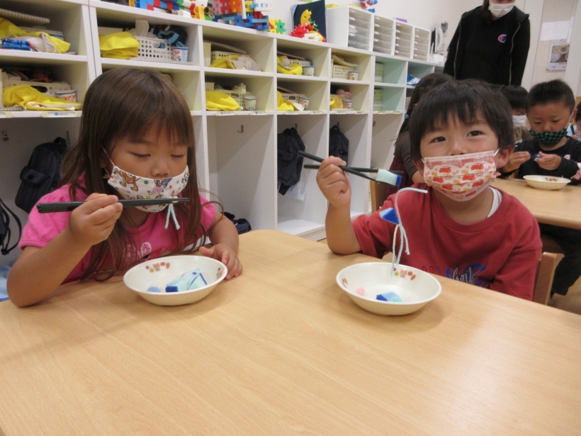 無理強いすることなく、難しかったらフォークも用意していましたが「みてみてー」と箸を使って最後までチャレンジしている子が多くいました。