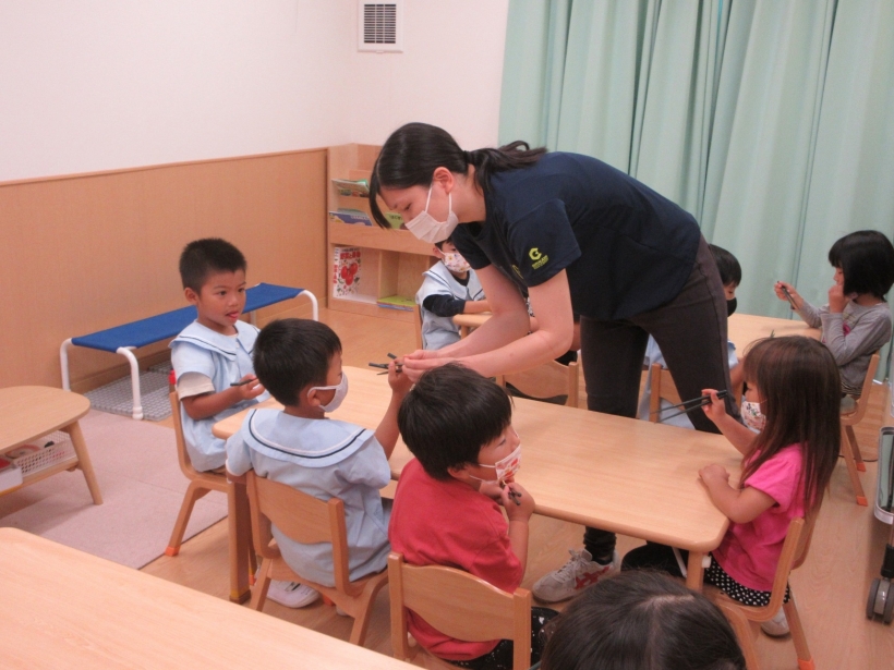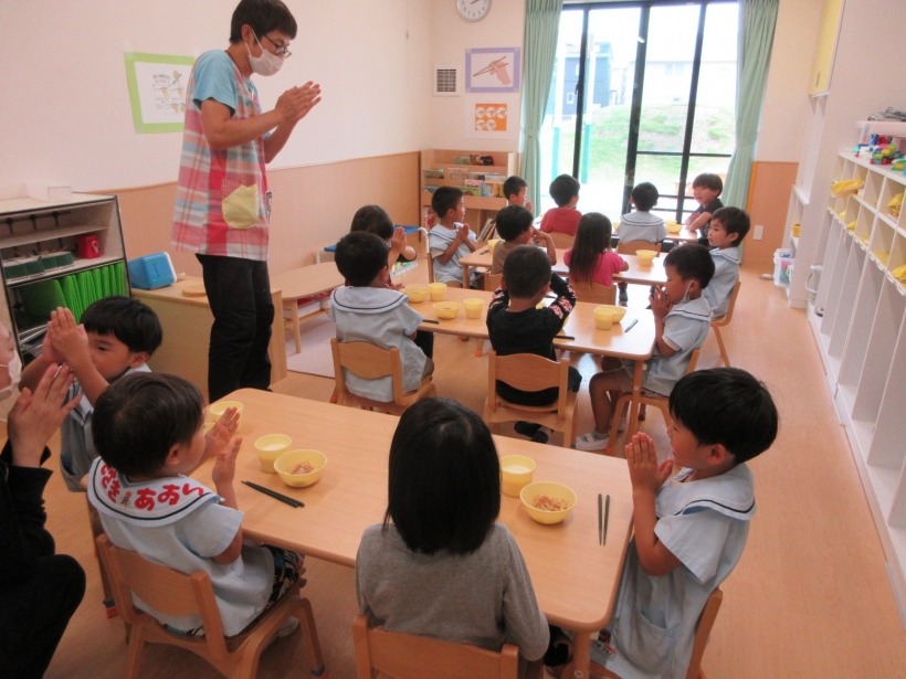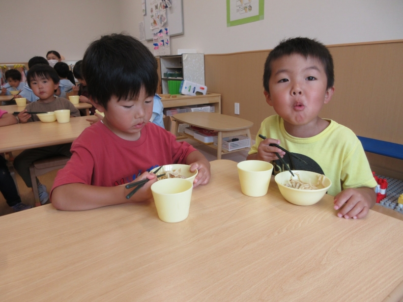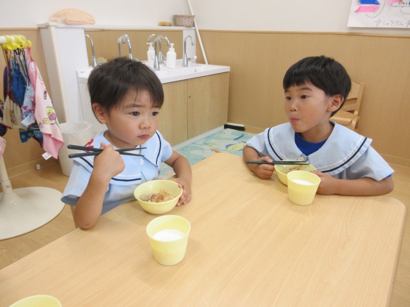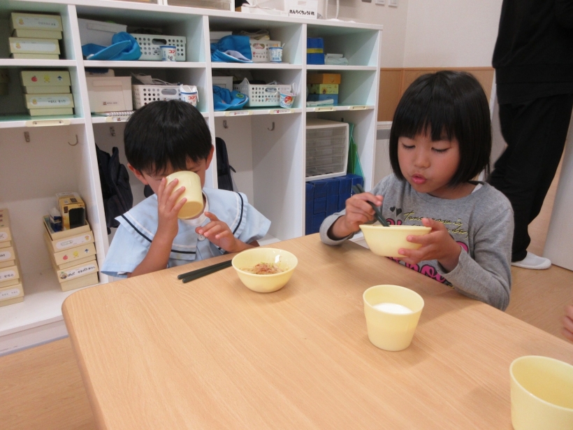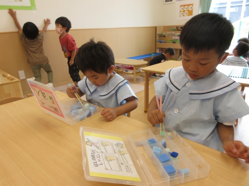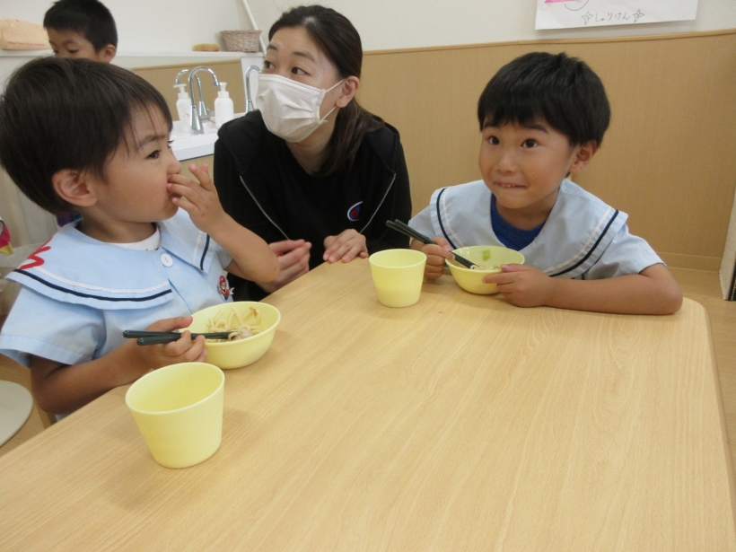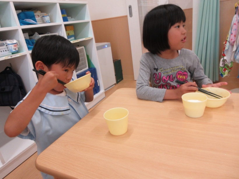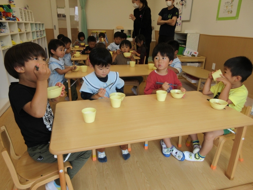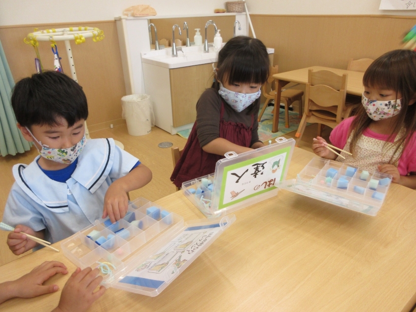 無理強いすることなく、難しかったらフォークも用意していましたが「みてみてー」と箸を使って最後までチャレンジしている子が多くいました。
