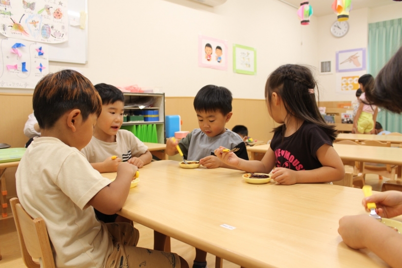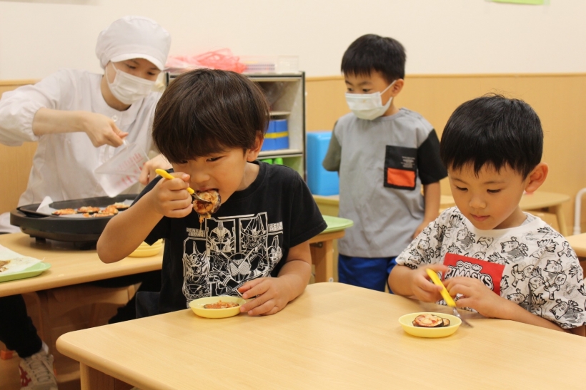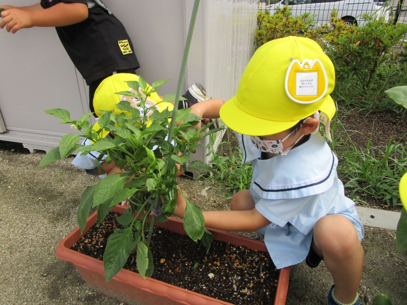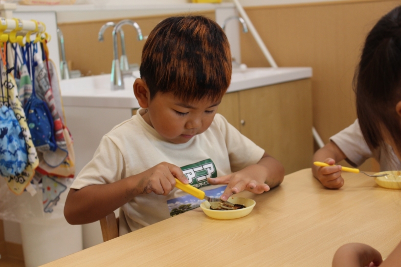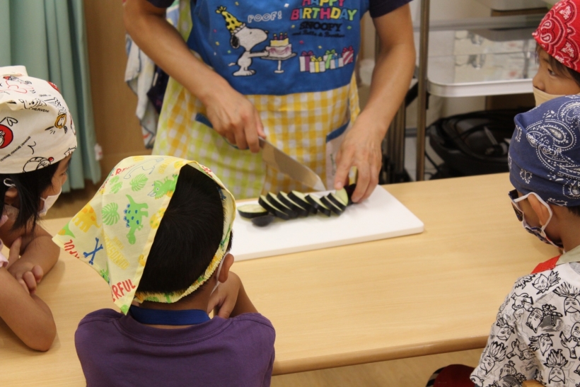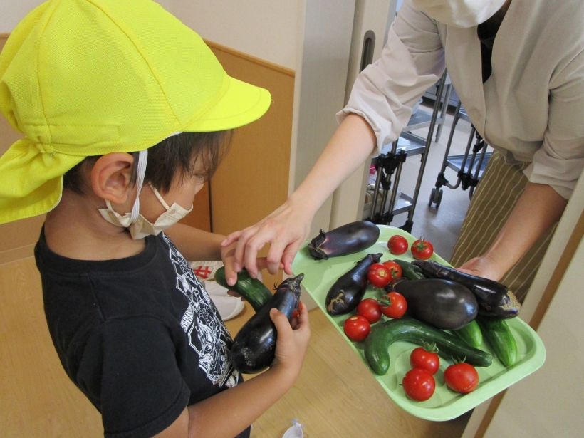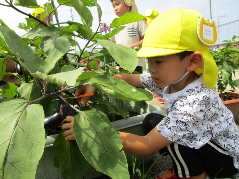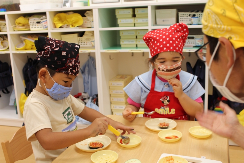 保育園で収穫したなすを使ってなすピザのトッピングを楽しみました。