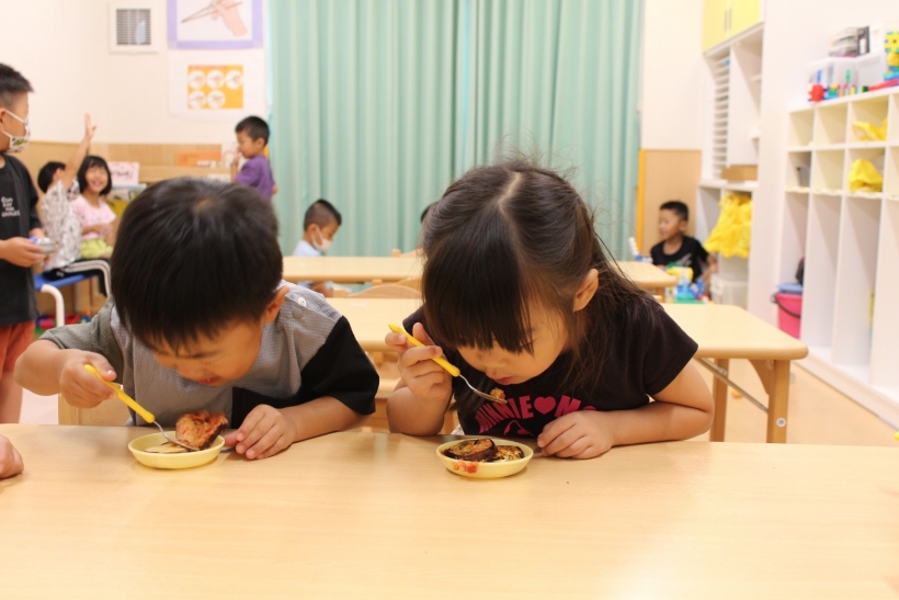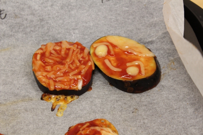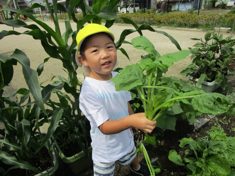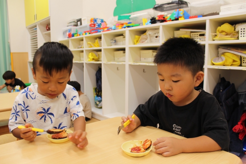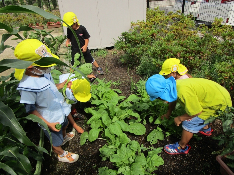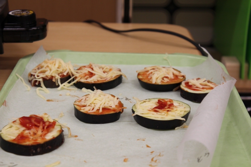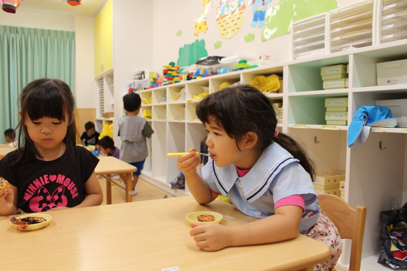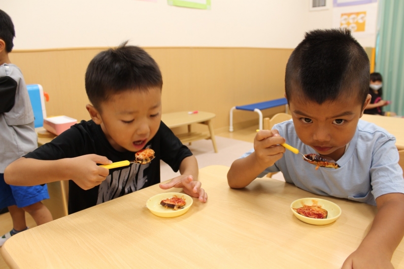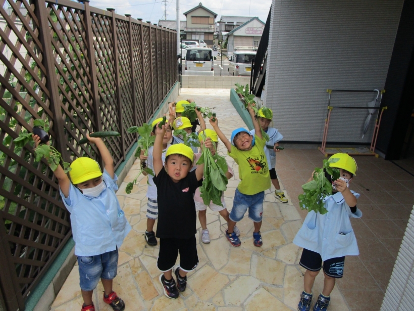 保育園で収穫したなすを使ってなすピザのトッピングを楽しみました。