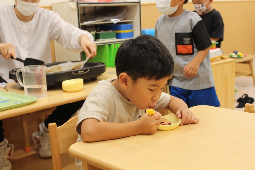 出来上がると匂いをかいで、「チーズのにおいがするね」と話していました。