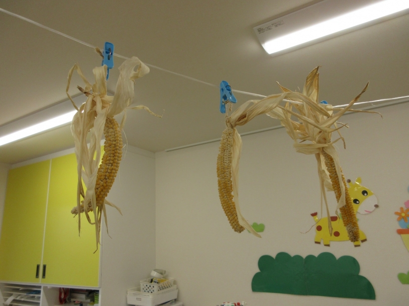 とうもろこしは収穫してから2か月間、保育室で乾燥させていました。
