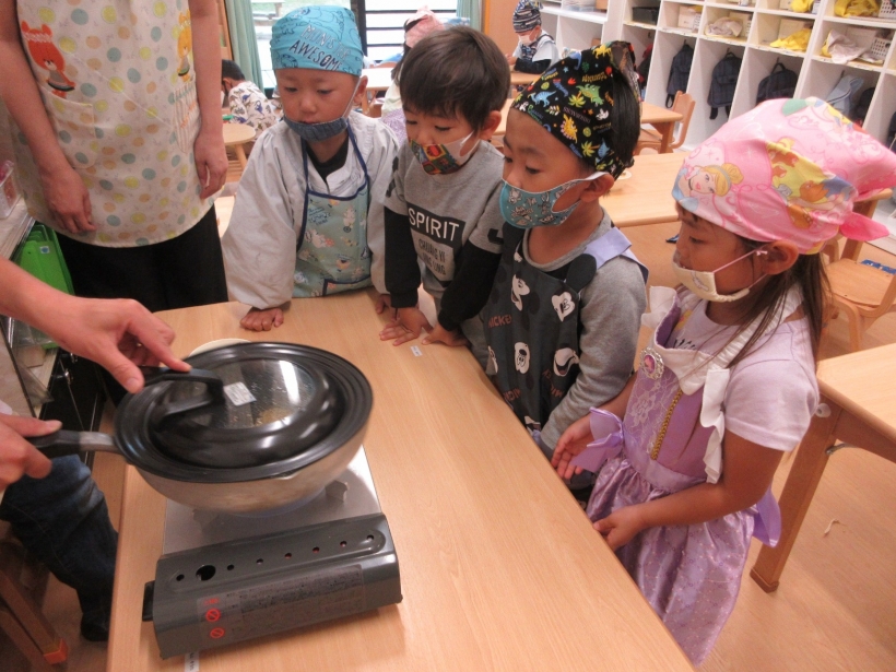 「ポンポンいってる!」「ジャンプしてる!」と、目をキラキラさせながらフライパンの中をのぞいていました。