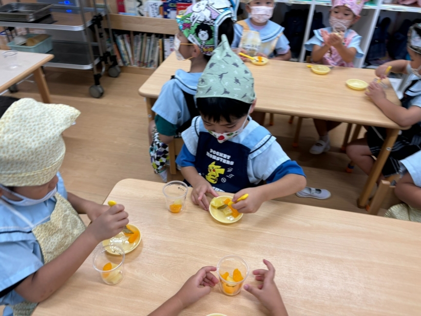 「いただだきます」と、満面の笑顔で食べ始める子どもたち。自分で作ったゼリーはとても美味しかったようです。来月からも、色々なクッキングを考えていますので、楽しみにしていてください。
