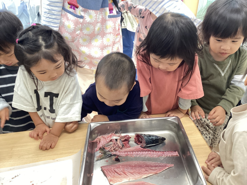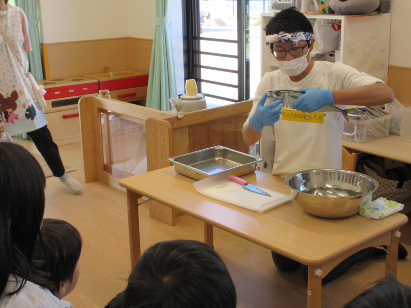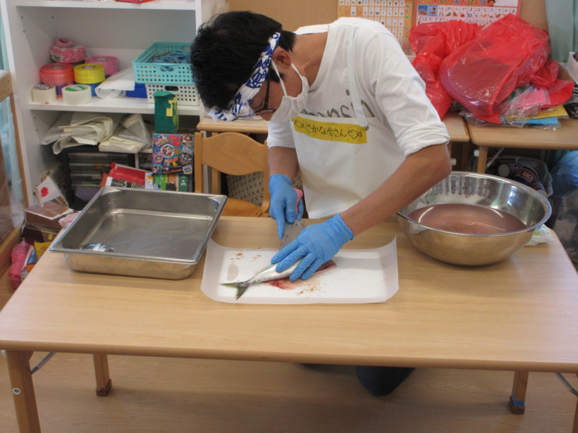 魚屋さんとなった保育者が、子どもたちの前でサバをさばきました。