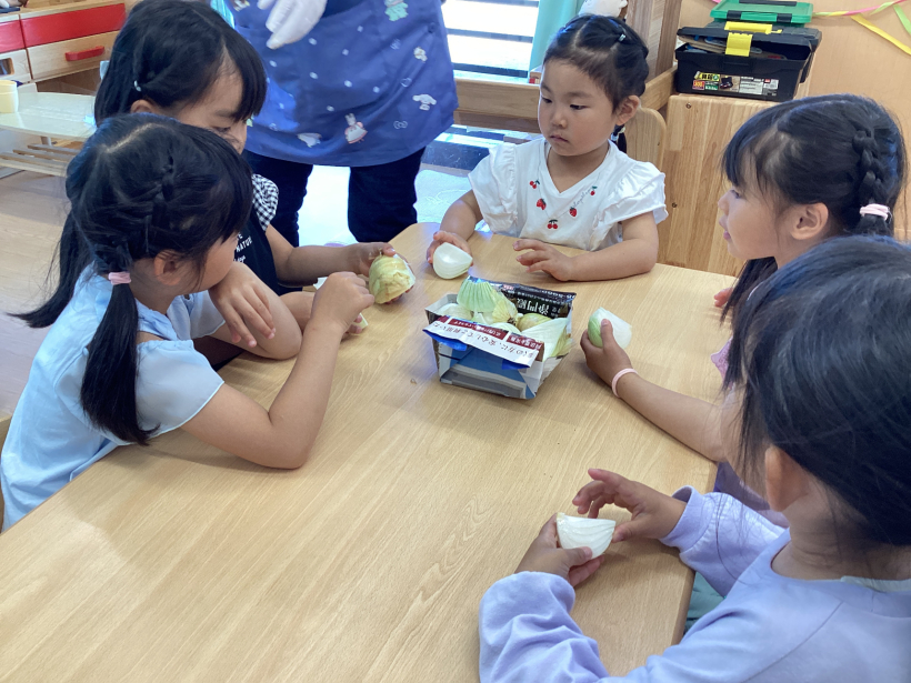 「いいにおいがする」「なみだがでてきた!」と発見した事を友だち同士で話し合っていました。