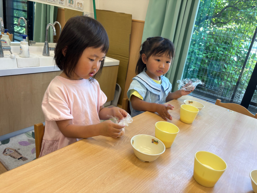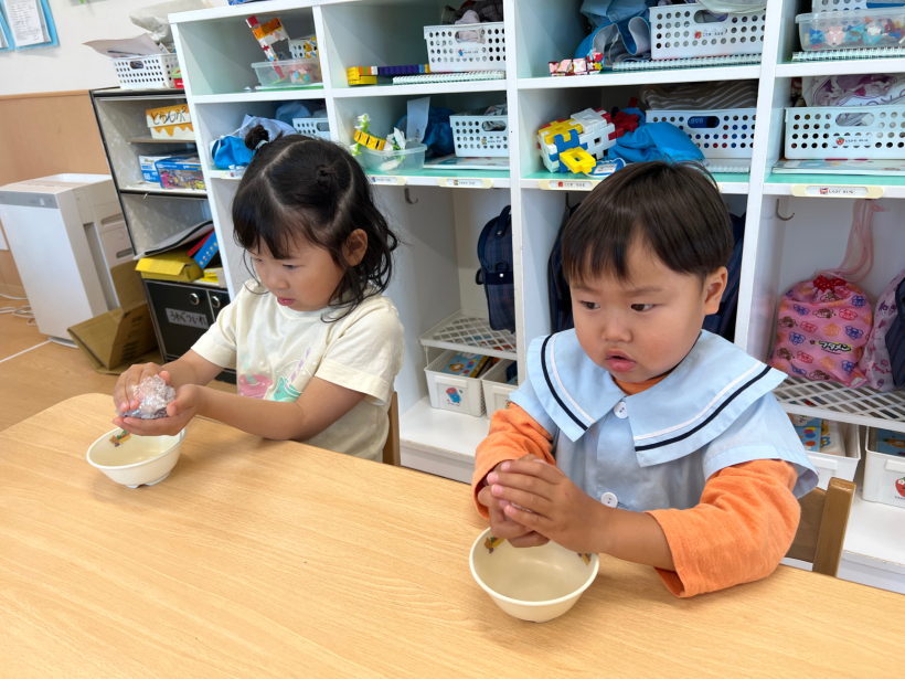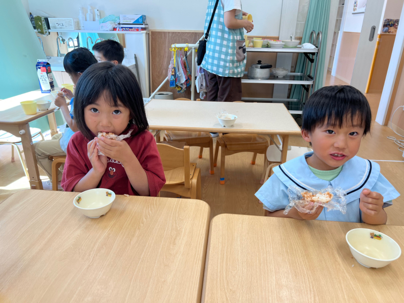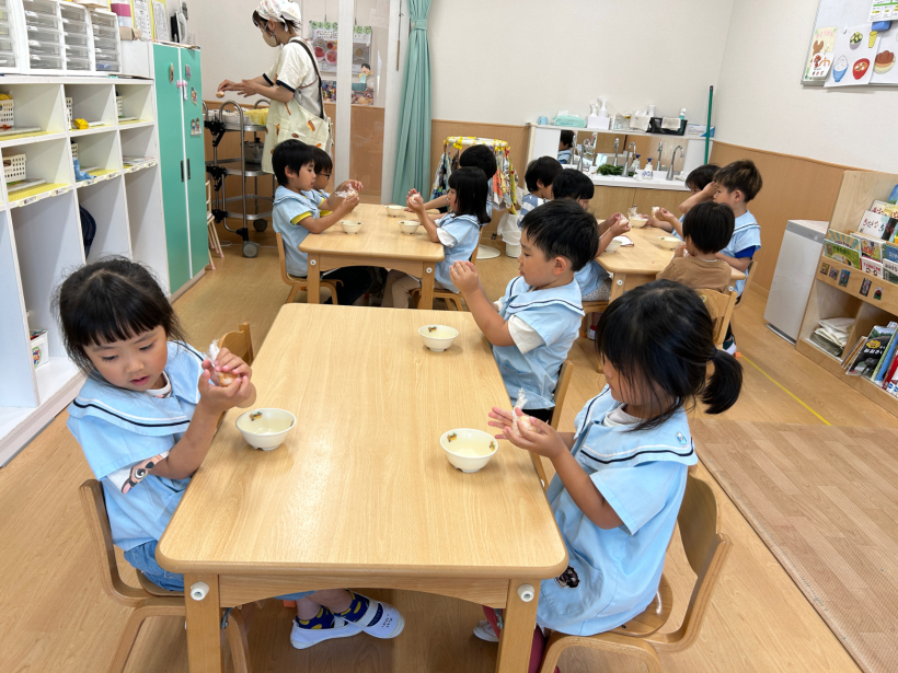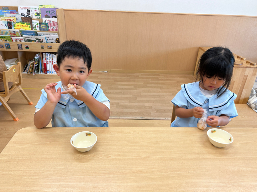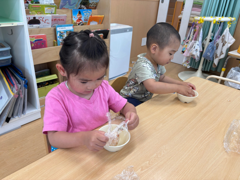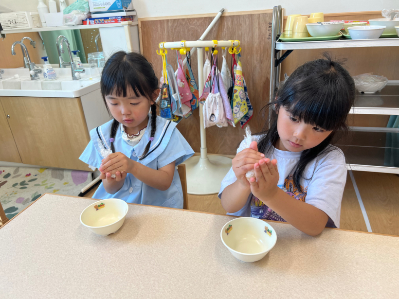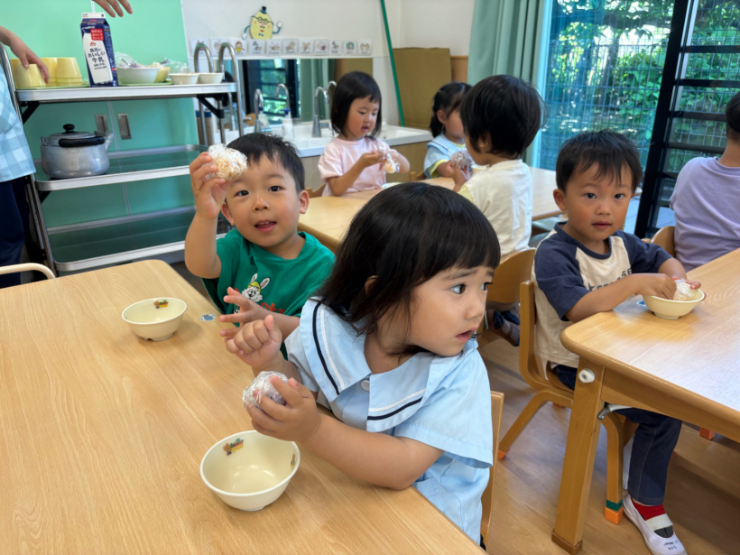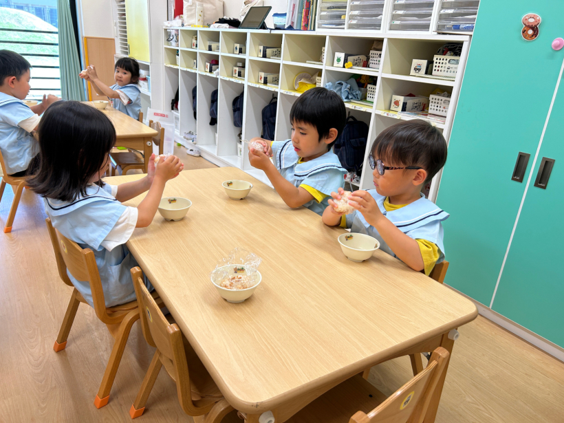 おにぎりを作ろう! おにぎりを作りました。 ぱんだ組は、初めてのクッキングで朝から楽しみにしていました。 保育者から作り方の説明を聞き、鮭とゆかりから好きな味を選ぶと、「おいしくなーれ」と言って、色々な形のおにぎりを握っていました。 完成したおにぎりは、午後のおやつで食べました。 自分で握ったおにぎりは格別だったようで、あっという間に完食していました!