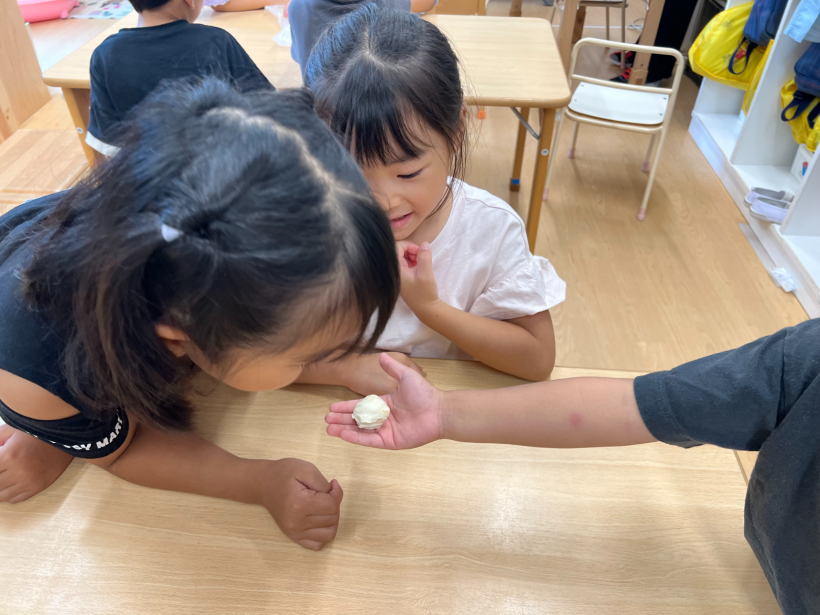 「しろいからこむぎこかな?」「こしょうだとおもう!」と色々な子ども達なりの意見が出て、予想をしながらワクワクしていました。