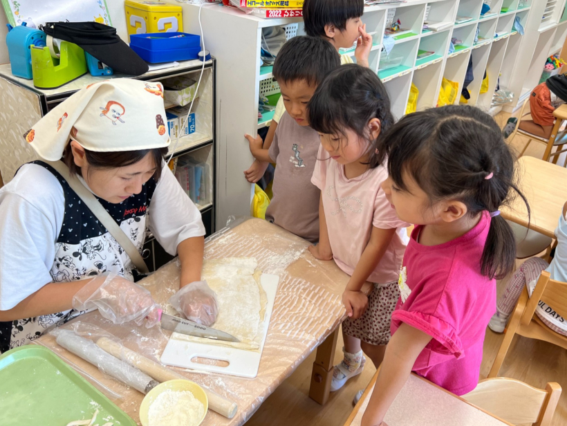 午後は、寝かした生地を麺棒で伸ばす所からスタートしました。園では、初めて使う麺棒に苦戦しながらも、グーッと前に押して、戻してを繰り返してどんどん上手になってきました。