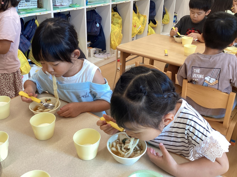 うどん作りの大変さを感じ、みんなで協力して作ったからか、「すーぱーのうどんよりおいしい!」とうどんが苦手な子もおかわりしていました。