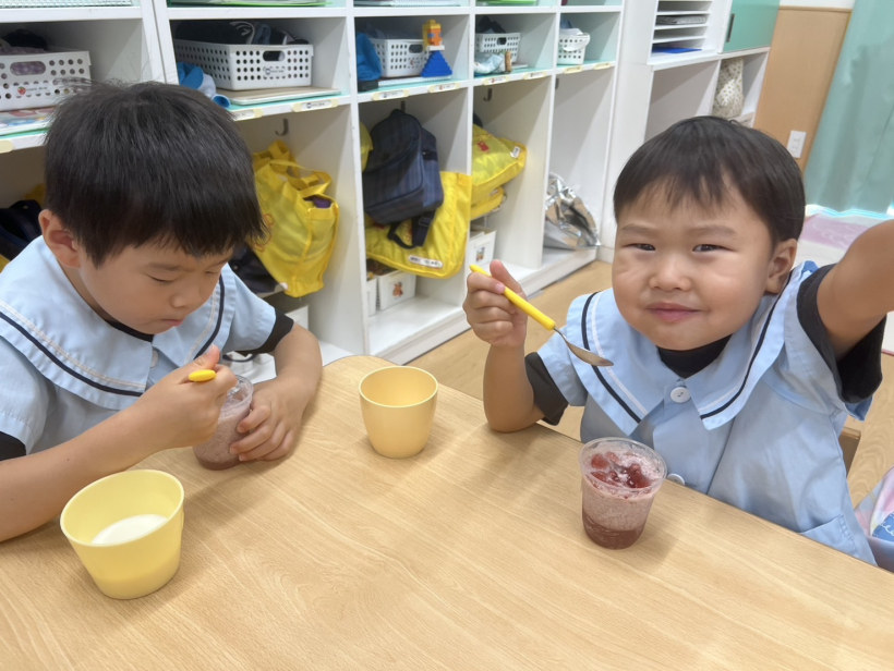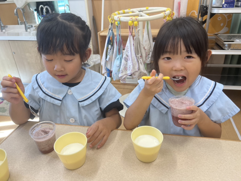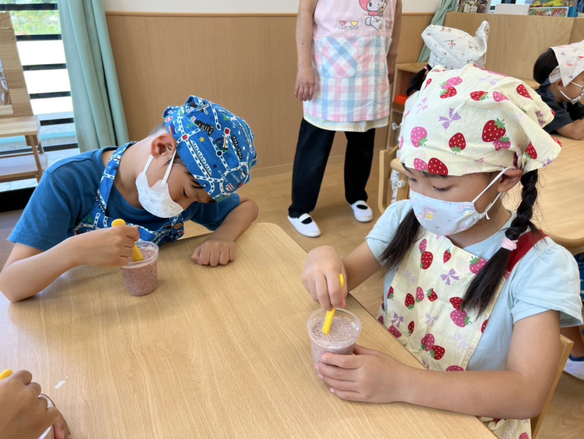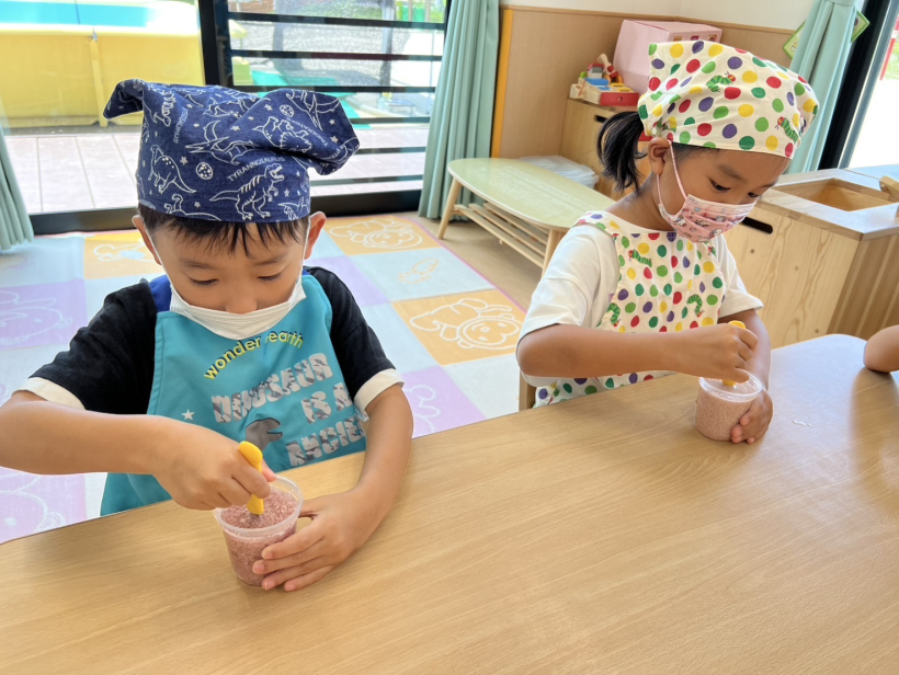 「おいしくなーれ」「これ、まぜてるのにわかれるのかな?」と、不思議そうにしながら混ぜ合わせていました。