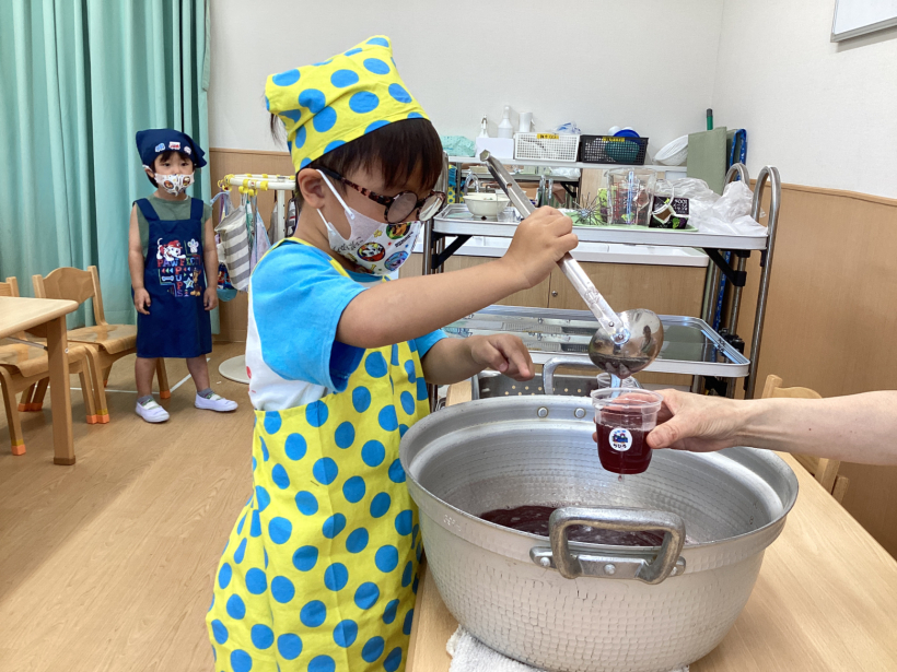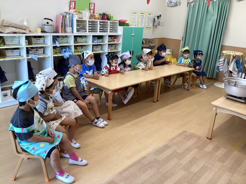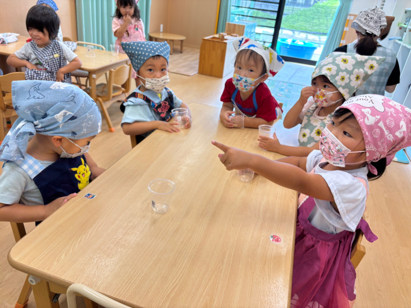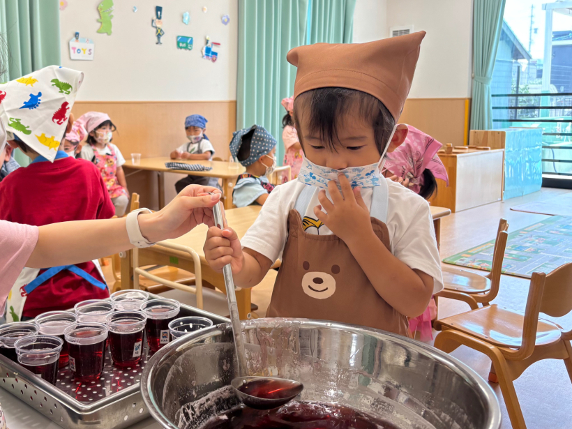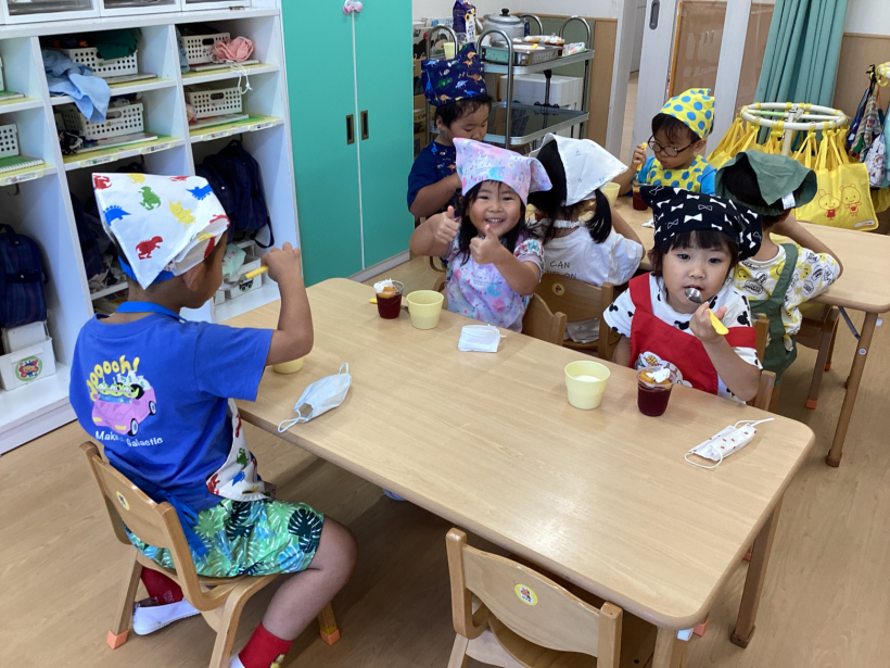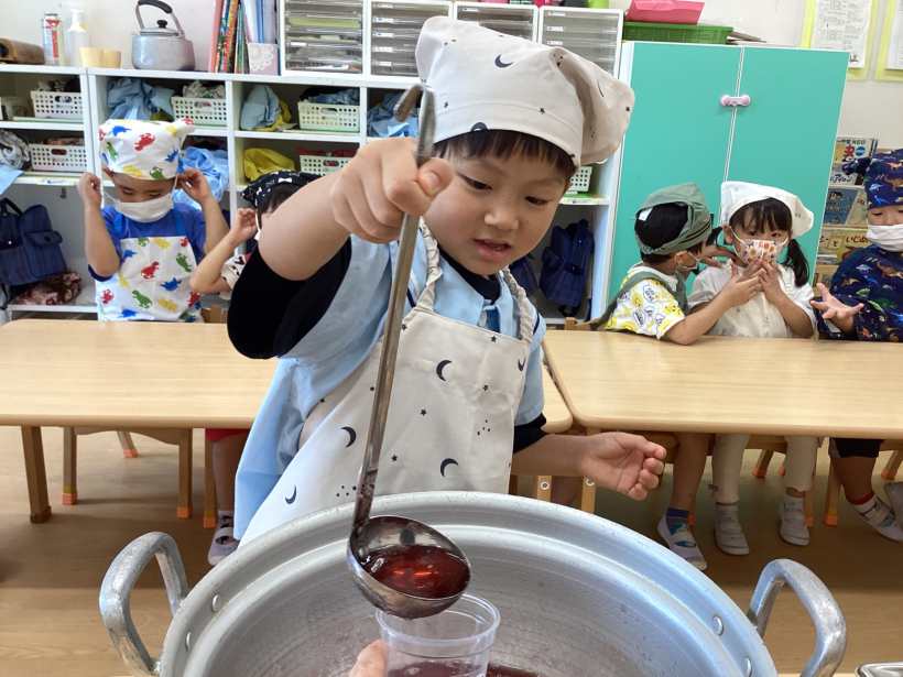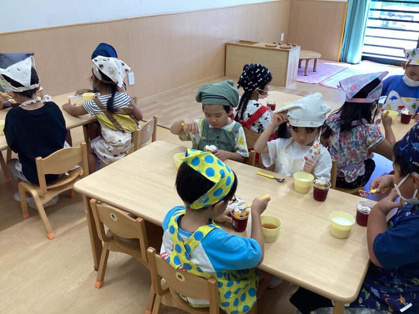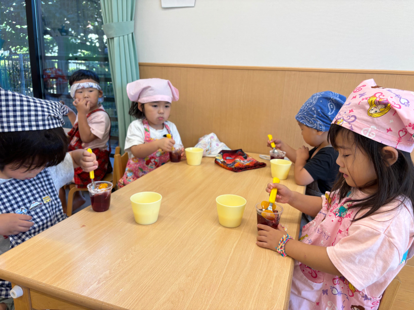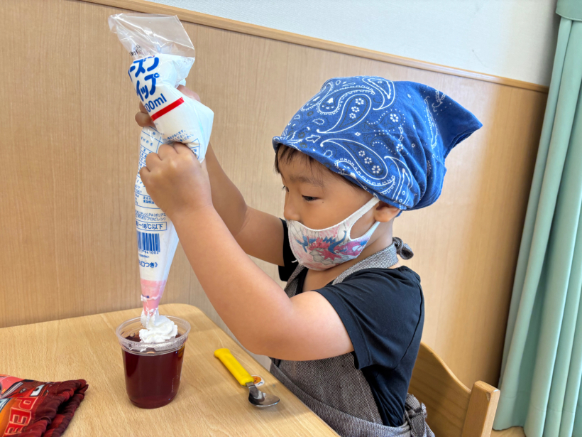 ゼリー作り【ぱんだ、きりん組】 子どもたちが楽しみにしていたクッキングでゼリー作りをしました。 火を使うため、近くに行かない約束をするとみんな椅子に座って保育士の行う工程を 興味津々で見ていました。 ゼリー液ができあがると1人ずつおたまで液をすくってカップに入れることができました。 冷蔵庫に入れて固まったゼリーができあがると次はホイップクリームでトッピングです。 嬉しそうに「ぎゅー」とクリームを絞ってオリジナルゼリーが出来上がりました。 出来上がったゼリーを美味しそうに食べていました。