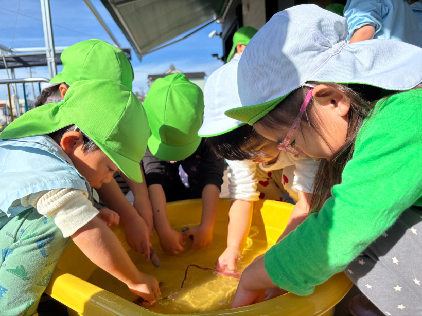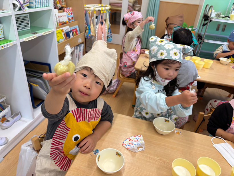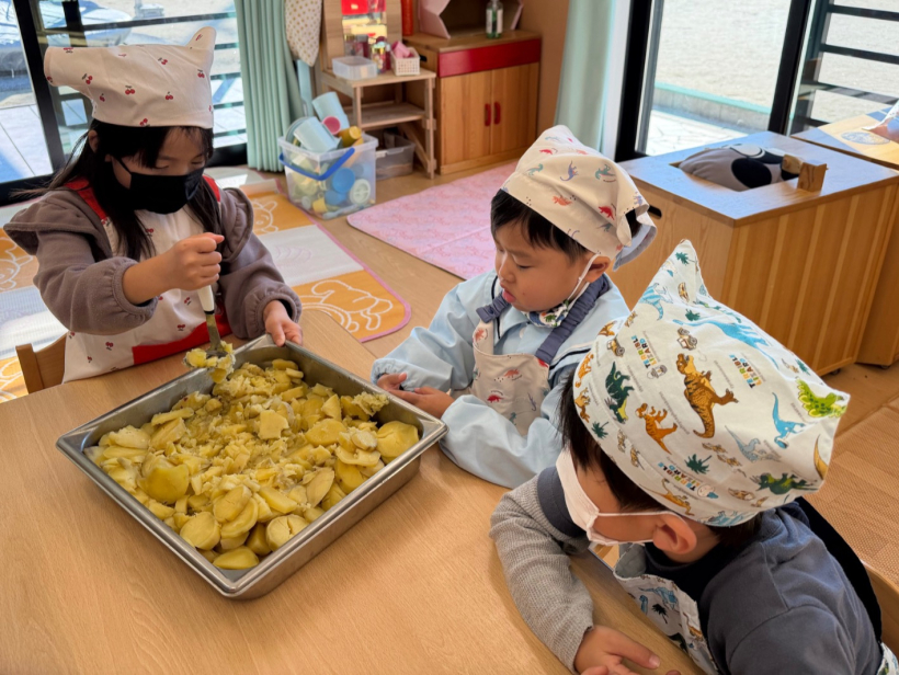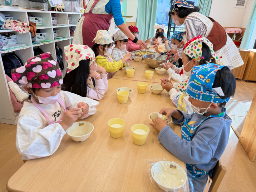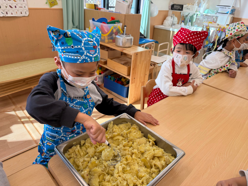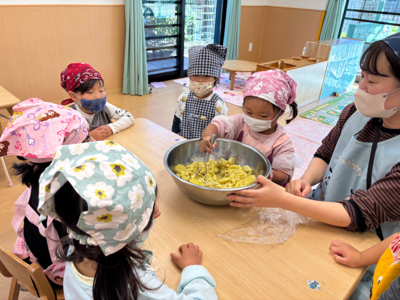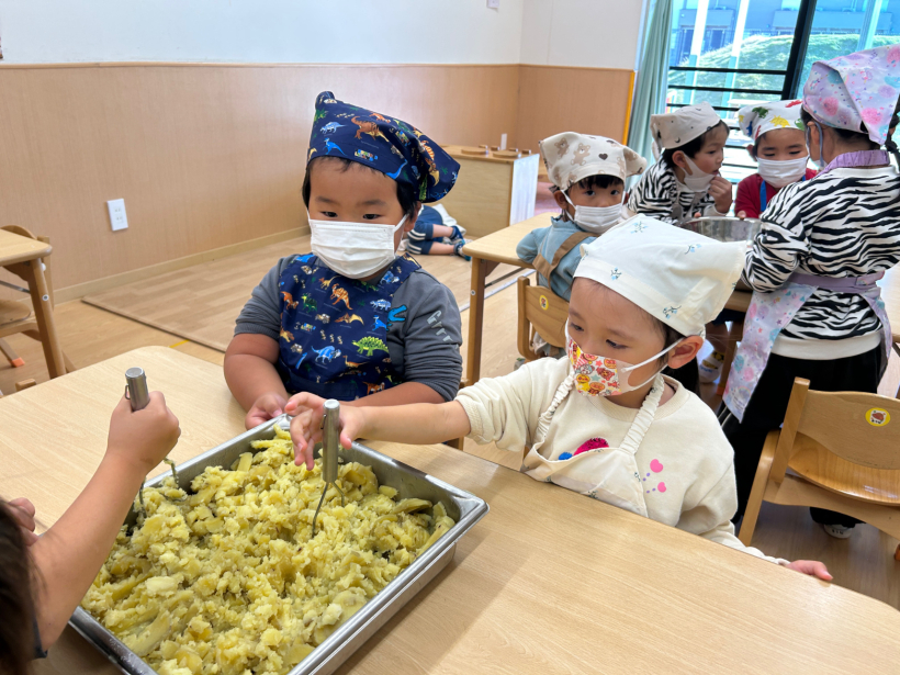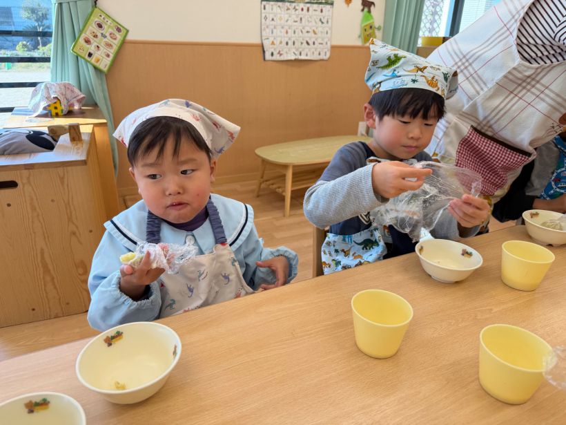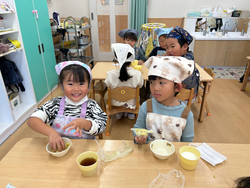 茶巾絞り みんなでクッキングで使うさつまいもを洗いました。 ぱんだ組のみんなもお手伝いしました。 グループの友だちと協力しながらマッシャーを使ってさつまいもを潰しました。 どうして「茶巾絞り」という名前になったのか話を聞いた後は、実際に作ってみました。 形を丸く整えたらラップで絞り目をつけて完成です!! 「あまい!」「おいしいね!」とさつまいもの甘さに驚いていました。 自分で作ったおやつは格別で、「おかわり」と沢山食べていました。