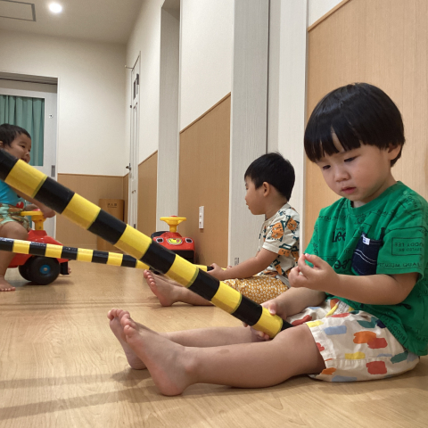 廊下でコンビカーに乗って遊びました。遮断機を置いてみると「ね、閉め...