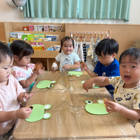 ひなまつりの製作では、足形を取り、はさみやのり、シール貼りと様々な...