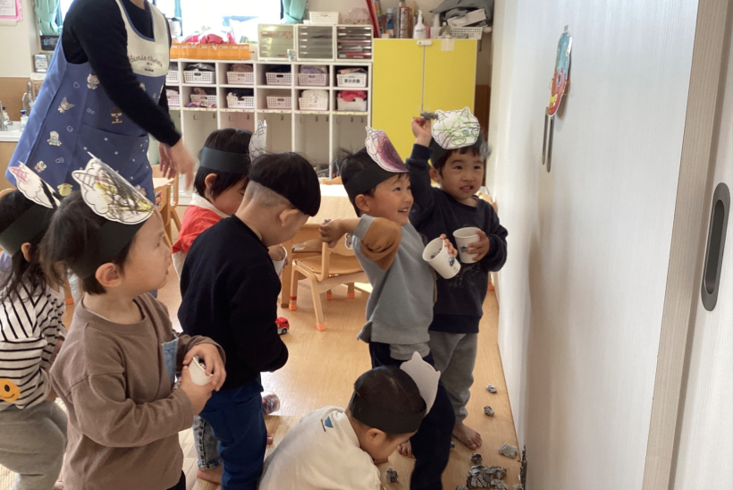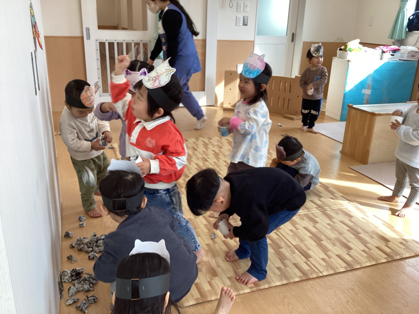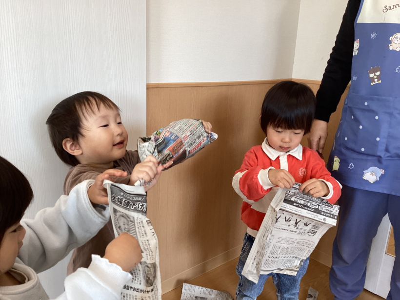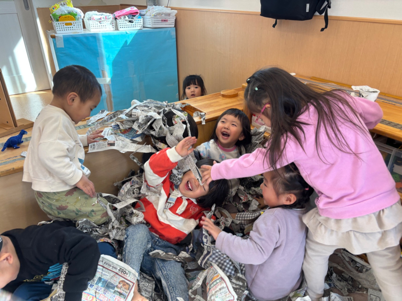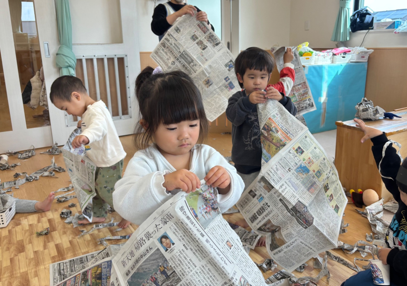新聞紙を一箇所に集めて、プールにしたり細くちぎってラーメンを作る子もいました。