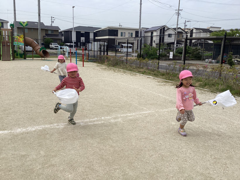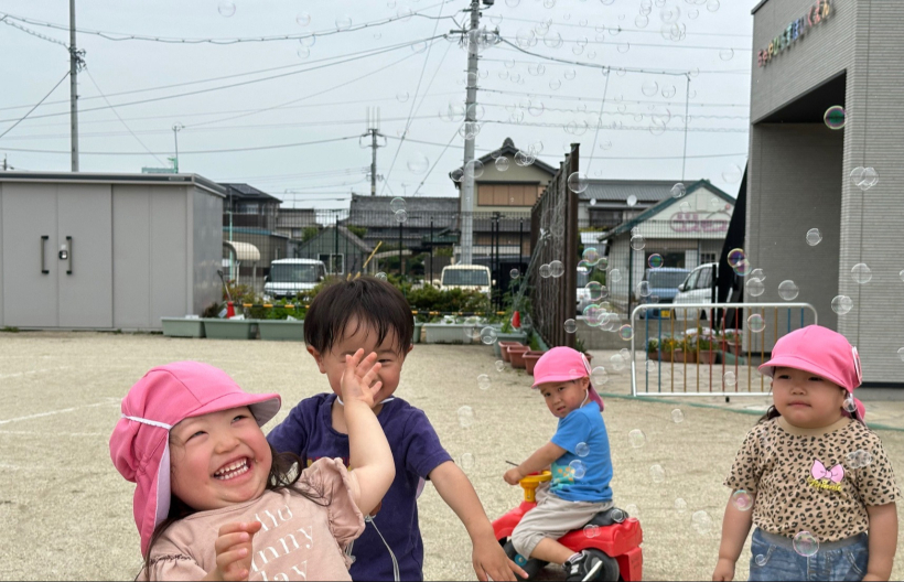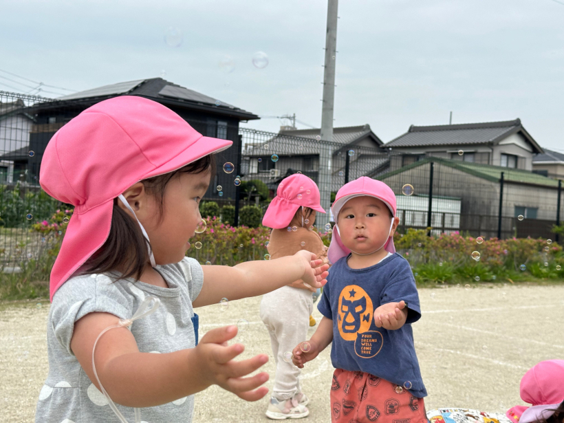 園庭で、シャボン玉をして遊びました。たくさんのちいさなシャボン玉に大喜びでした。指先でつんつんしてみたり、シャボン玉めがけて走ってみたり思いきり楽しみました。