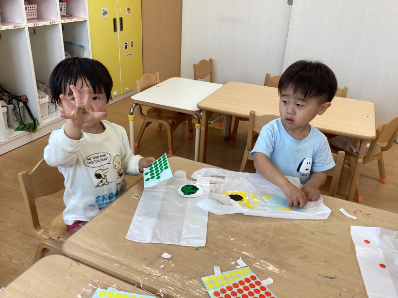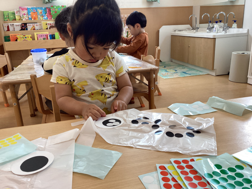 製作遊びをしました。ビニール袋にいろんな色の丸シールを貼って模様をつけて、目玉をつけたら“こいのぼり”の完成です。シールを台紙から剥がすことにも挑戦しました。完成したこいのぼりは、園庭で泳がせて楽しみました。