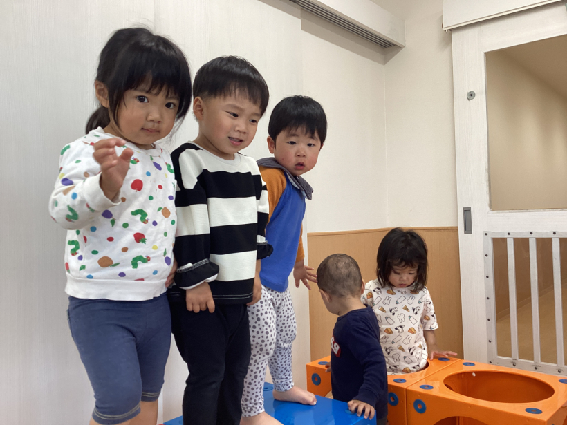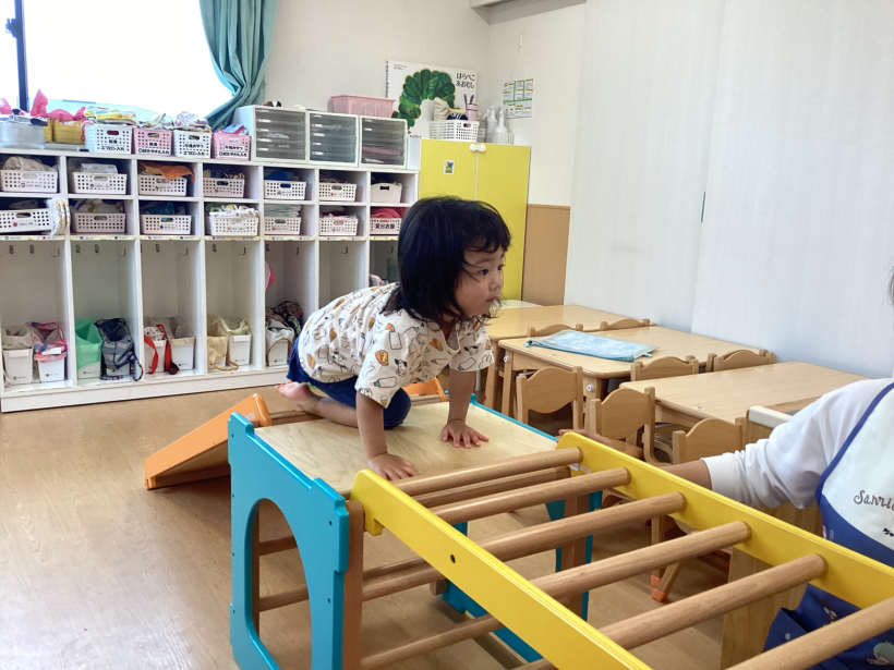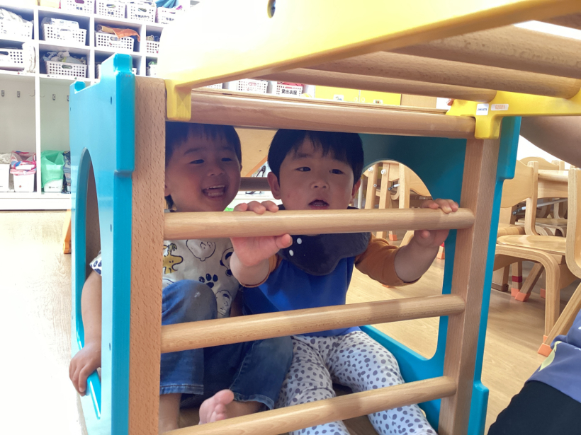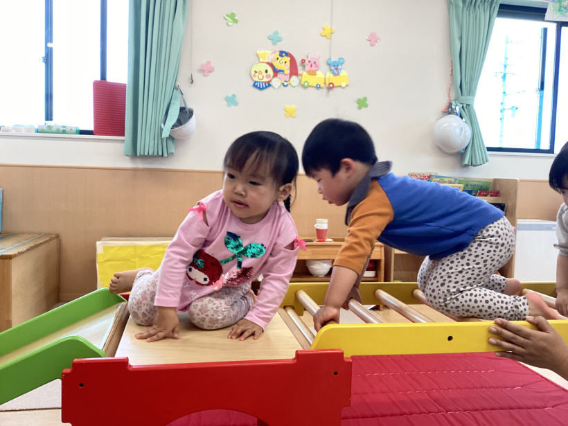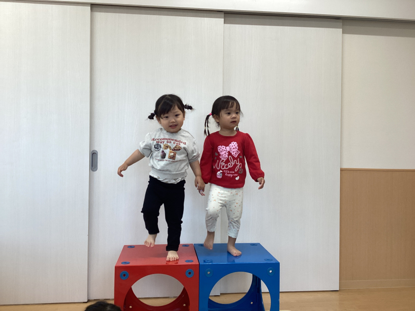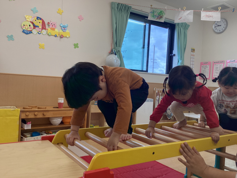運動遊びをしました。はしごを渡ったり、カラーボックスに登ったり、体を動かして遊ぶことが大好きです。