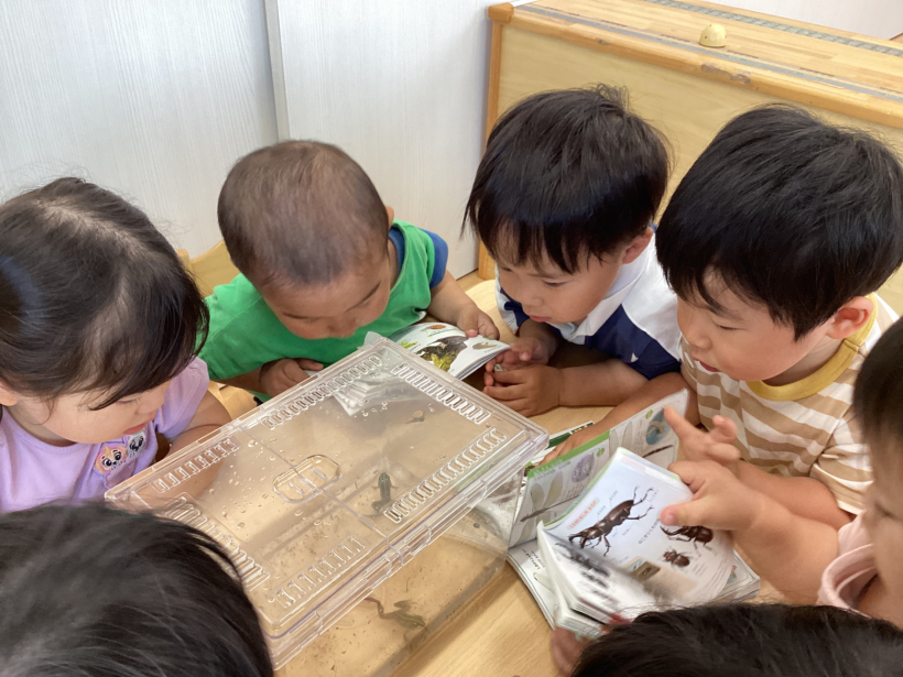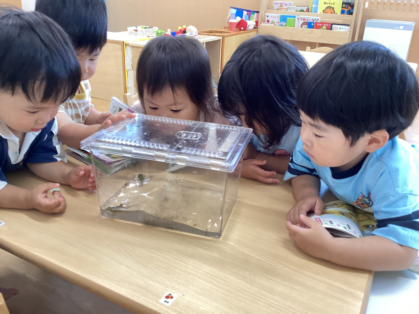 カエルを見せてもらいました。実際に動くカエルを見て「あっ、動いた!」「こっち見たよ」と興味津々でした。