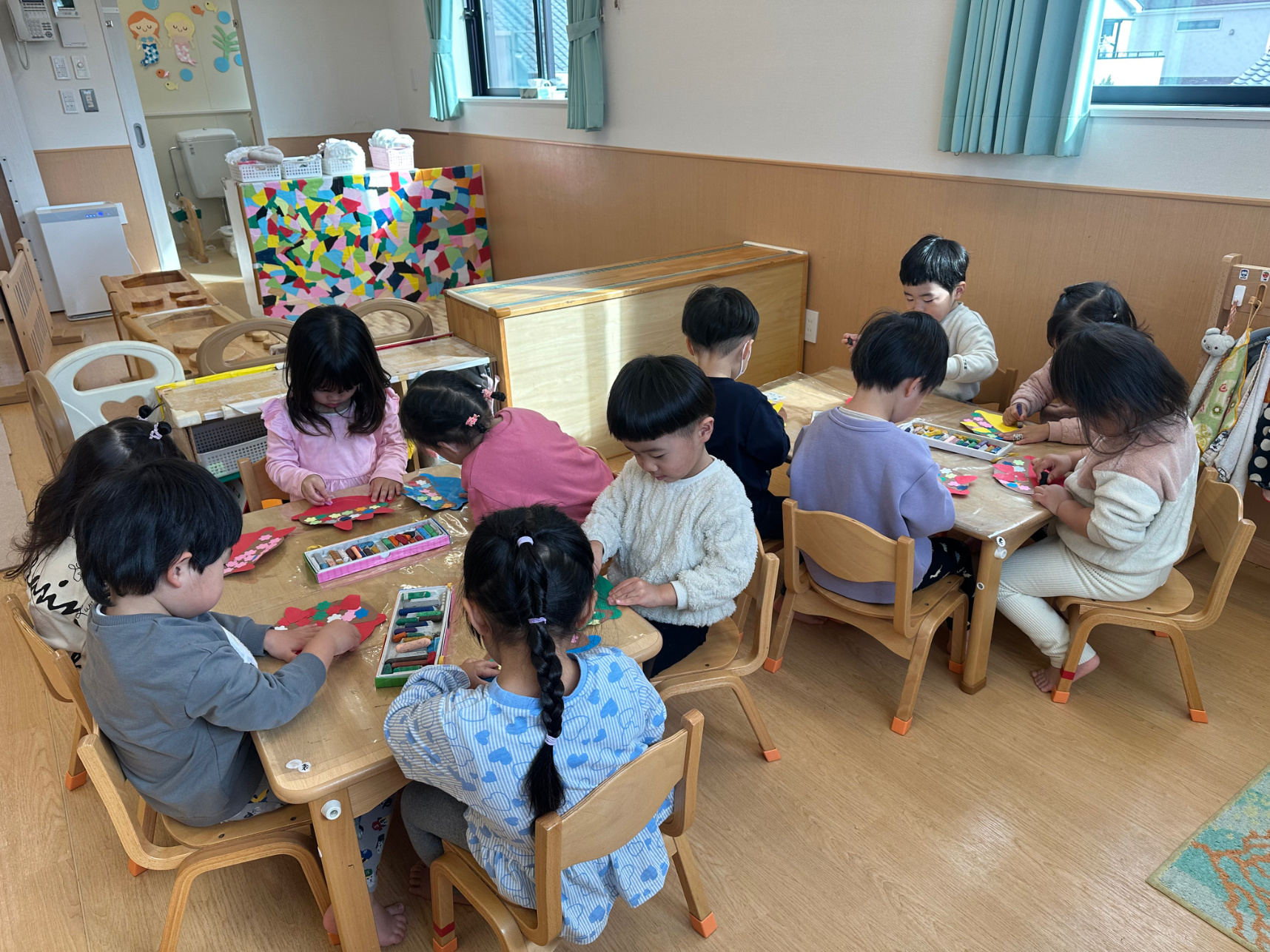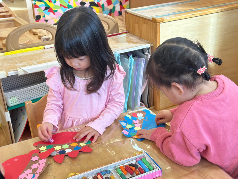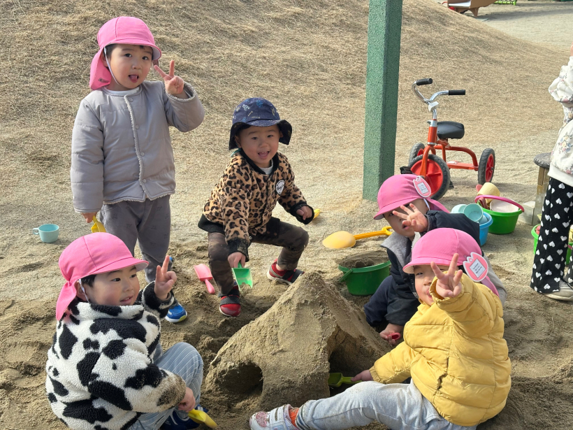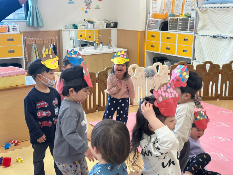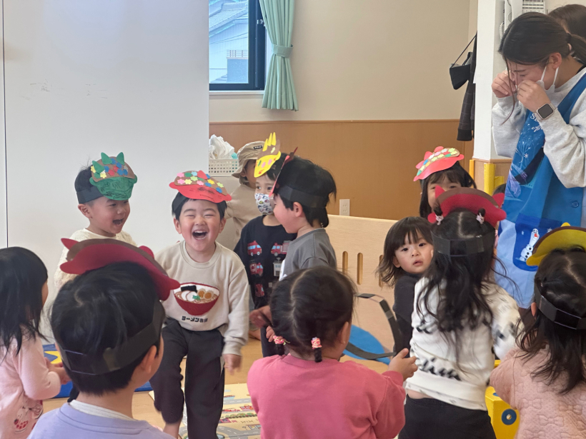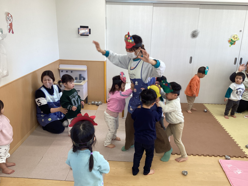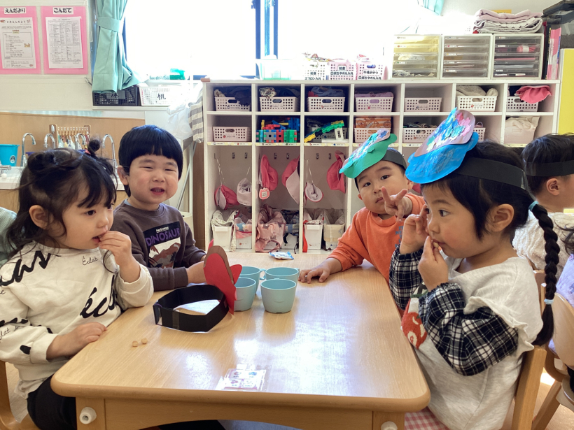 うさぎ組クラスニュース【2月】 節分なので鬼のお面を作りました。画用紙にのりで貼ったり、好きな色のクレヨンで顔を描いたりして、自分だけの鬼が完成しました。 節分では鬼のお面を被り、ひよこ組やりす組へ遊びに行きました。「おにだぞ〜」と言いながら友だちと、鬼の真似をして楽しんでいました。 天気のいい日には、園庭で体を動かして遊びました。友だちと遊ぶことが増えて、みんなで鬼ごっこをしたり、砂場で大きな山を作ったりして楽しみました。