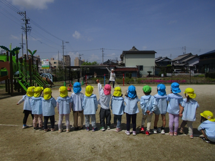 絵本を読み終えると、「わたしたちも、そとにでておえかきしたーい」と子どもたちからリクエストがあったので、園庭に出てお絵かきを楽しみました。