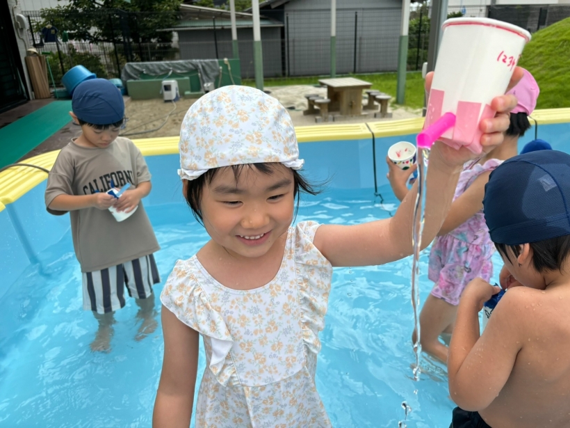 プールで泳ぐのはもちろん、水鉄砲をしたりフラフープを使って遊んだり、色々な玩具を使った遊びも楽しんでいます。