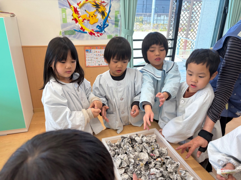 「ことしはどんなおにがくるだろうね?」「これくらいのおおきさなら、おにをおいだせるかな?」など話しながら、新聞豆を一生懸命作っていました。
