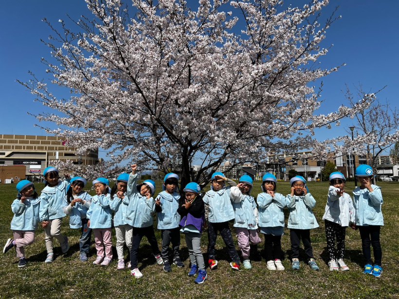 満開の桜の木が並んでいるのを見て、「きれーい」「かわいい」と興味津々でした。