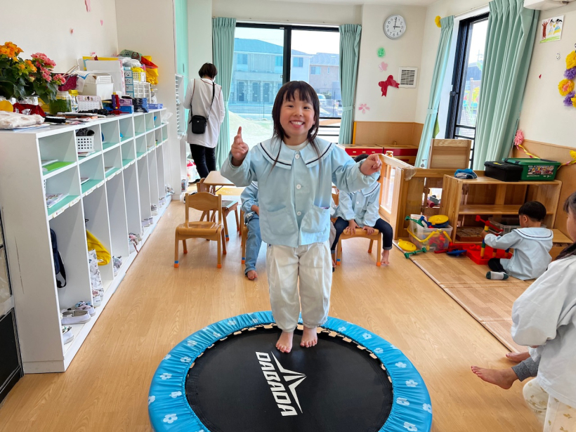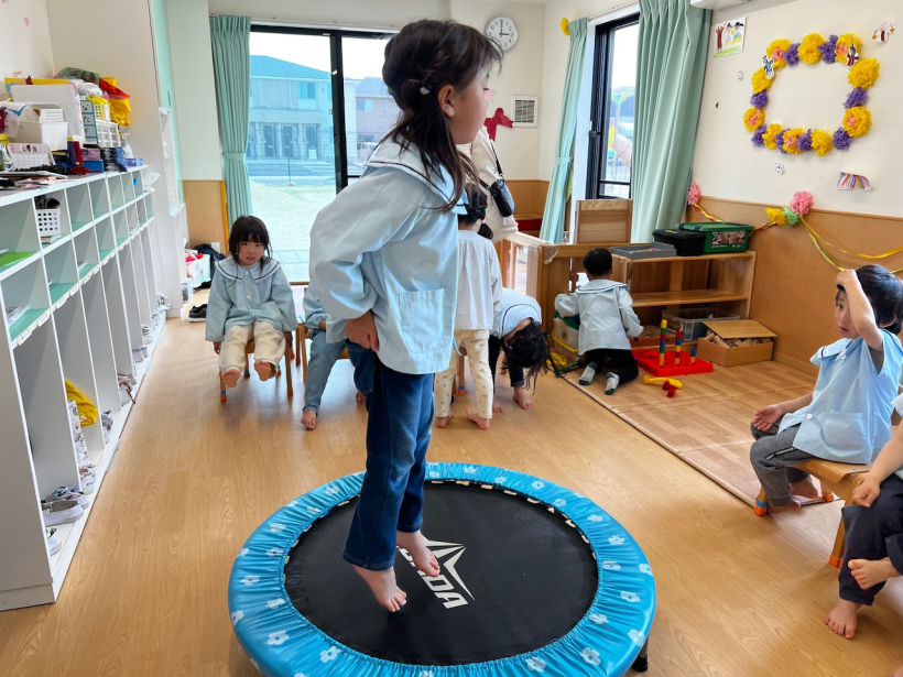 トランポリンが大好きで、保育者が準備を始めると、「やりたい!」と言ってみんな集まってきます。
