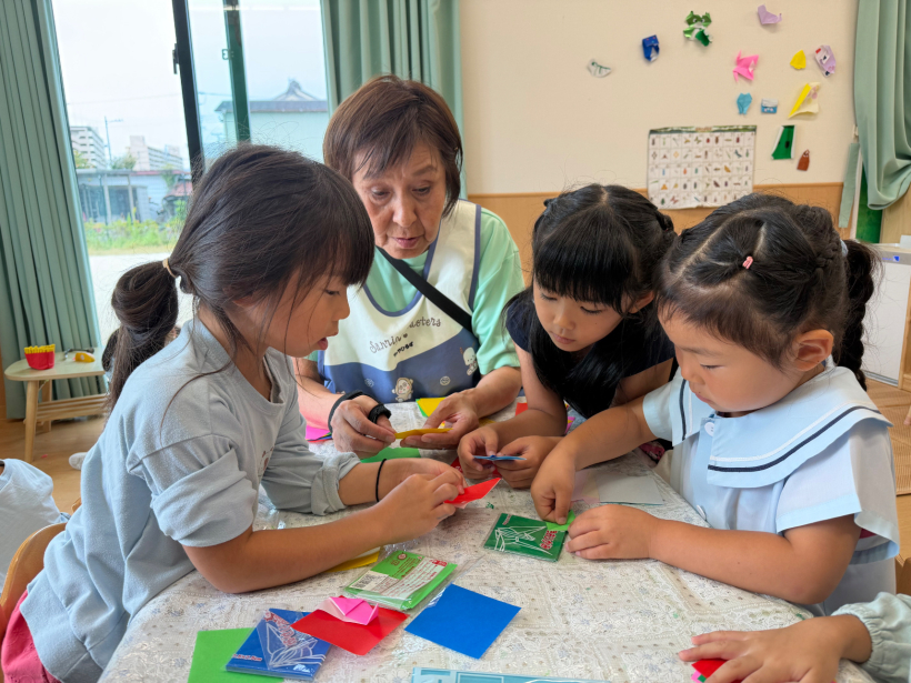 ハロウィンの絵本を読んだ後、「おみせやさんしたい!」の子どもたちの声から折り紙でのキャンディー作りが始まりました。