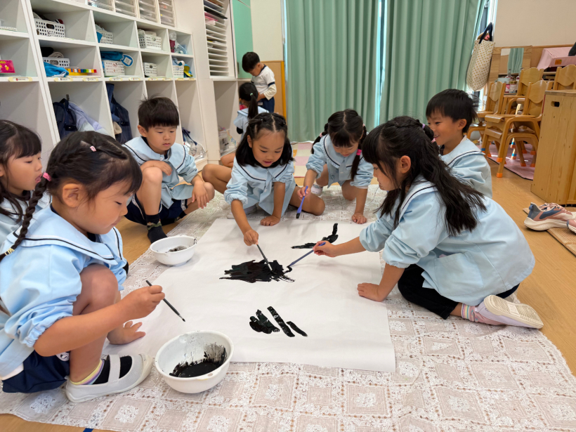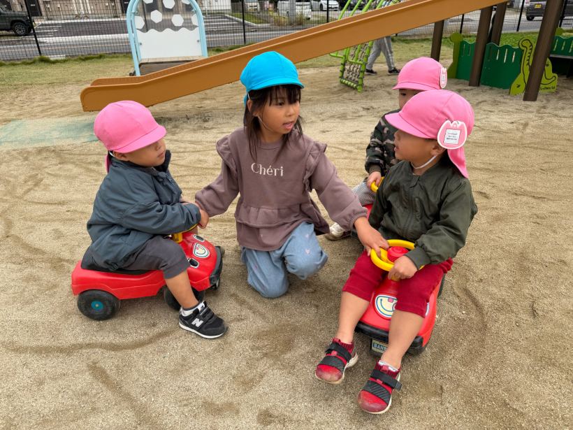 園庭で小さいクラスの友だちに会うと、「いっしょにあそぼう」と声を掛けたり、優しく遊び方を教えたりと、お兄さん・お姉さんの姿が見られます。