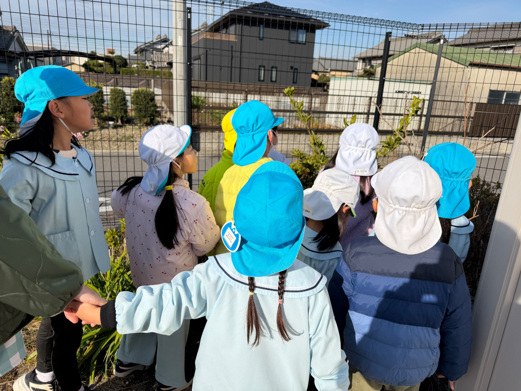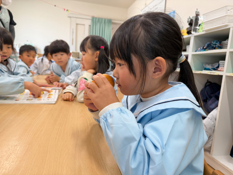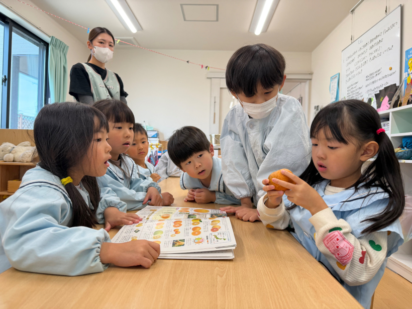 園庭に出ると、「おれんじいろになってきた!」「このみかんたべれるのかな?」とみかんの木の成長を楽しみにしていました。みかんの皮の匂いをかいだり、図鑑で調べたりして興味津々でした。