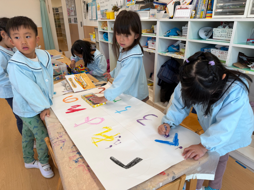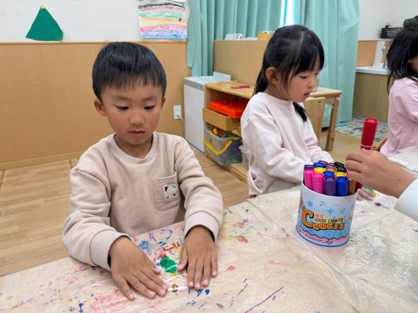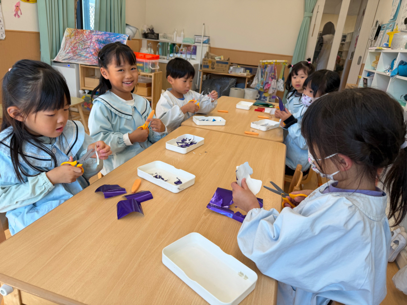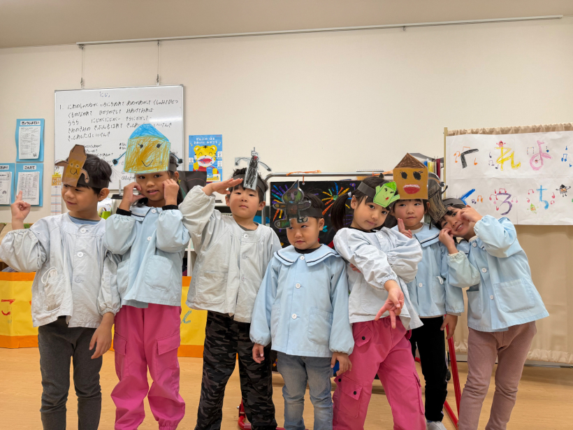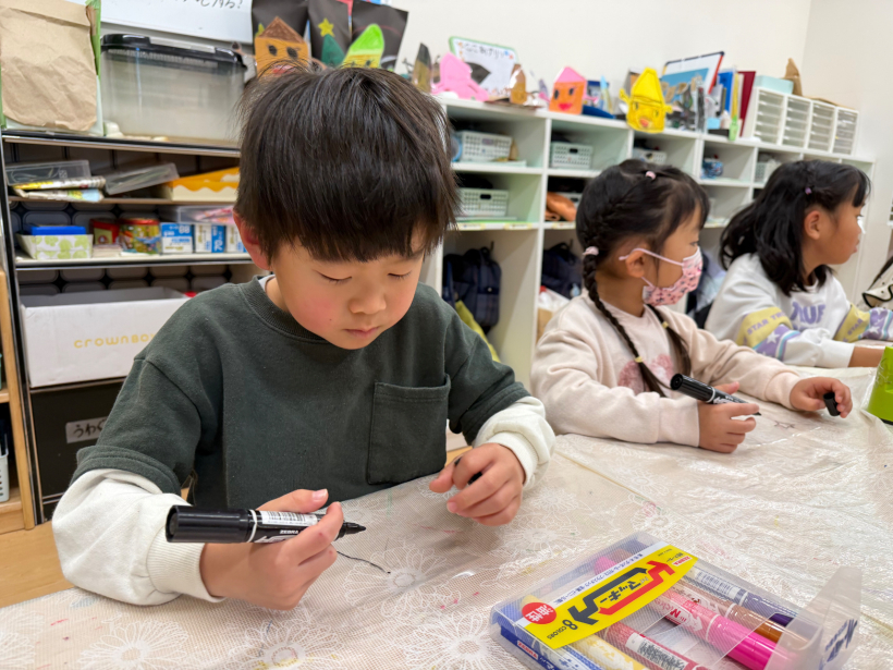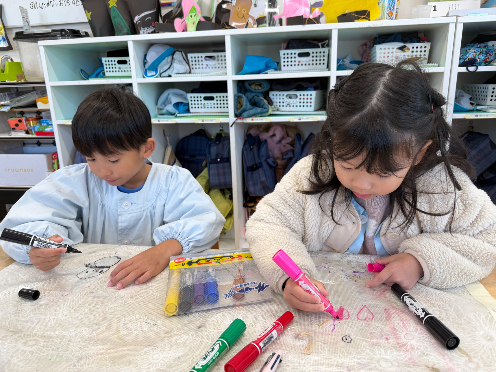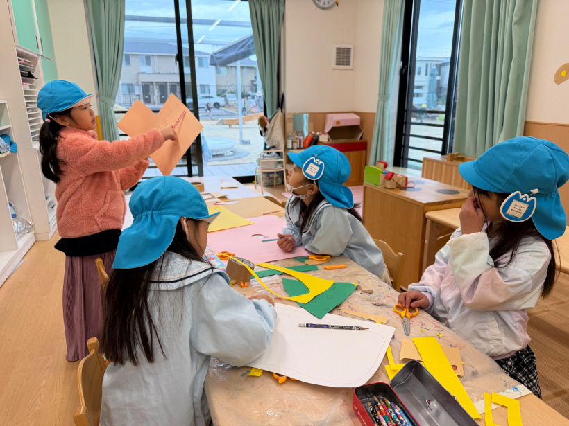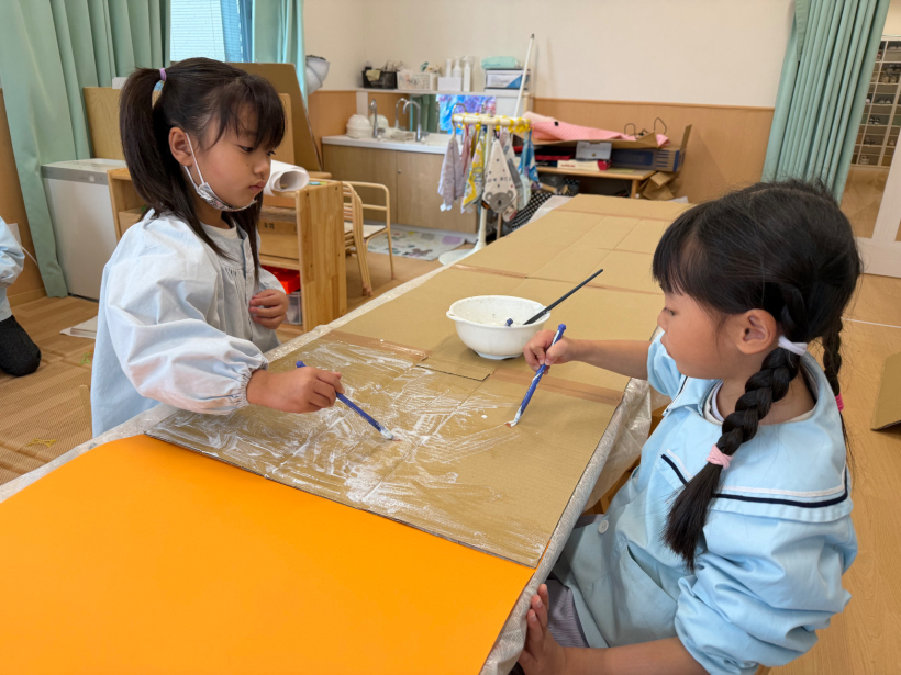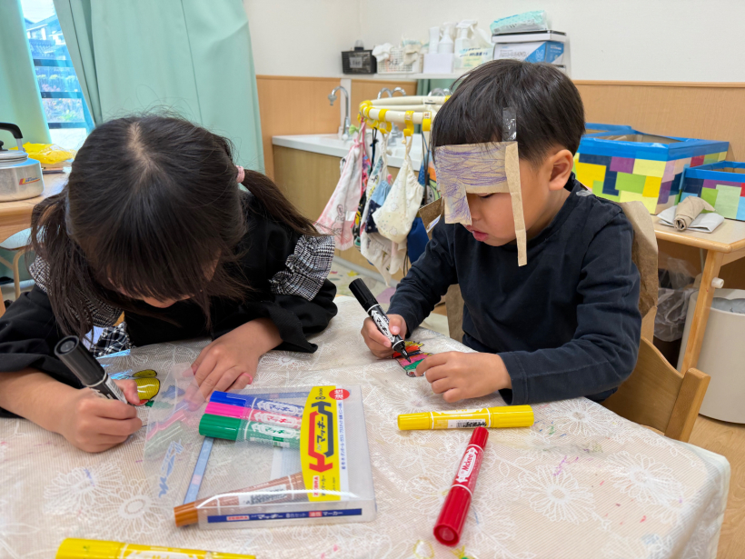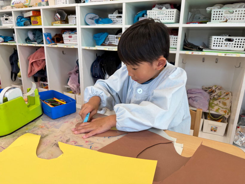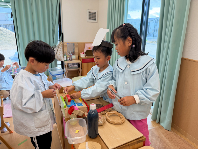 劇遊びに出てきた小道具は、子どもたちと一緒に作りました。「くれよんのくろくん」の絵本を見ながら、「これもつくりたい」「ほんものみたいにしようよ」とたくさんアイデアを出し合い、完成するたびにワクワクしていました。