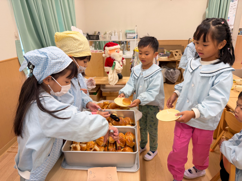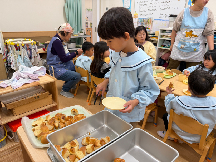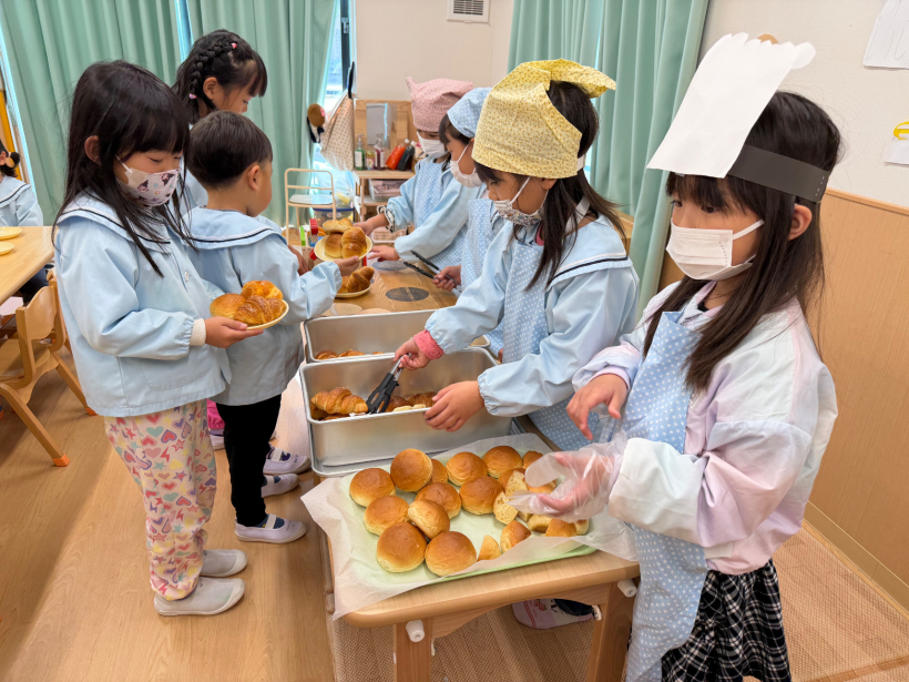 ドーナツやあんぱん、フランスパンなど色々なパンを自分たちで作り、どんどん遊びが広がって、しばらくパン屋さんごっこがブームになりました。