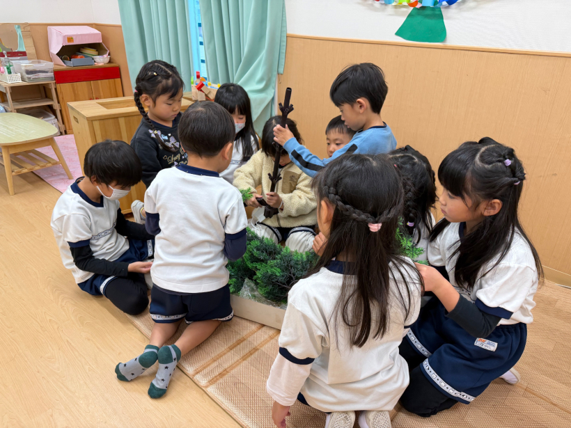 他のクラスの子がクリスマスツリーの前に立ち止まると、「ぞうぐみがつくったんだよ!」と嬉しそうに教えていました。