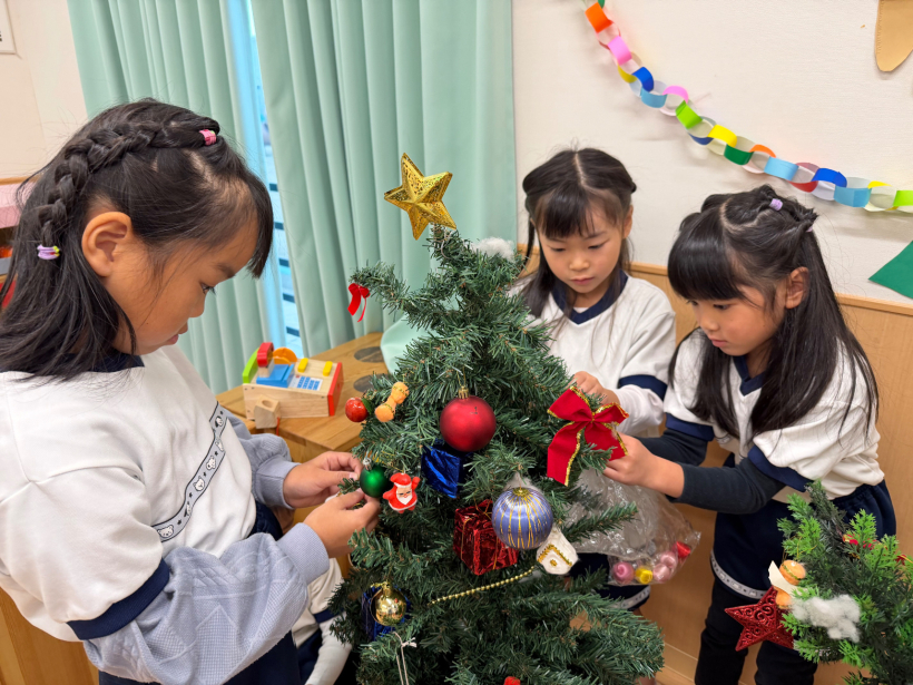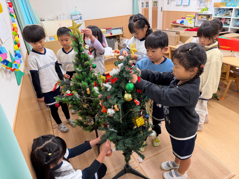 みんなで保育園に飾るクリスマスツリーの組み立てや飾り付けをしました。