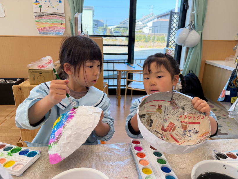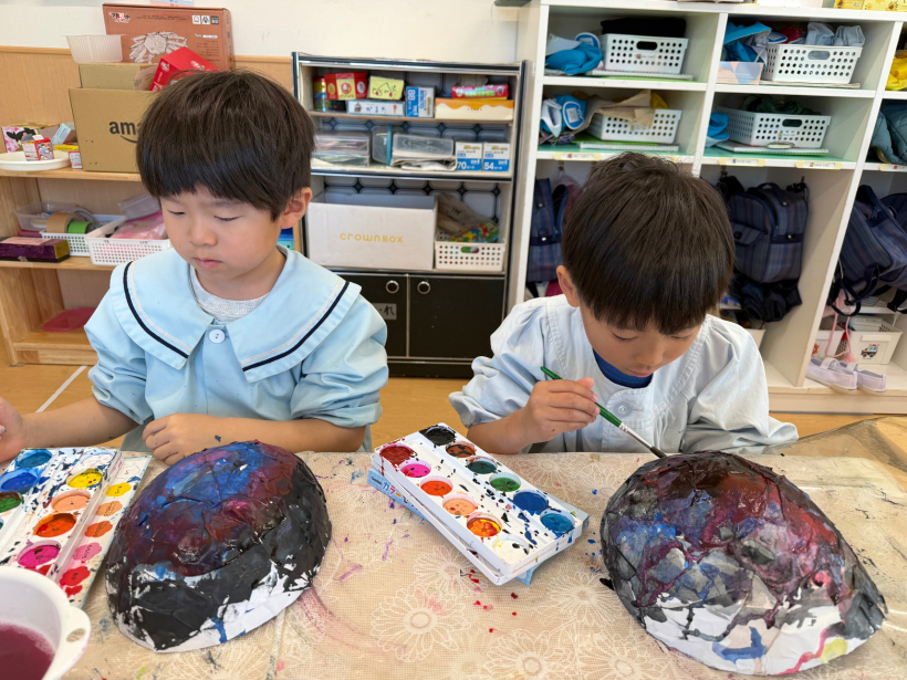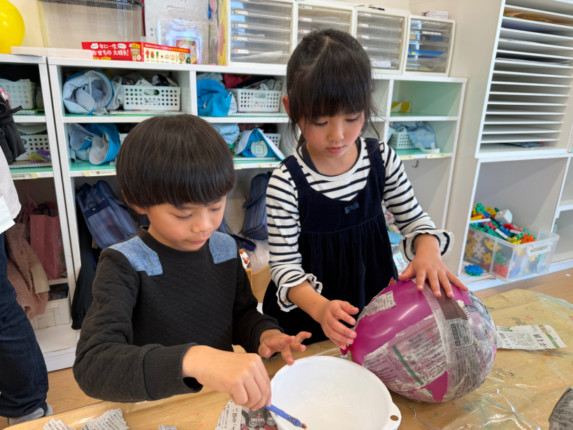 きりん組の時に張り子で風鈴を作った時よりも少し大きいサイズなので、友だちと力を合わせて作りました。