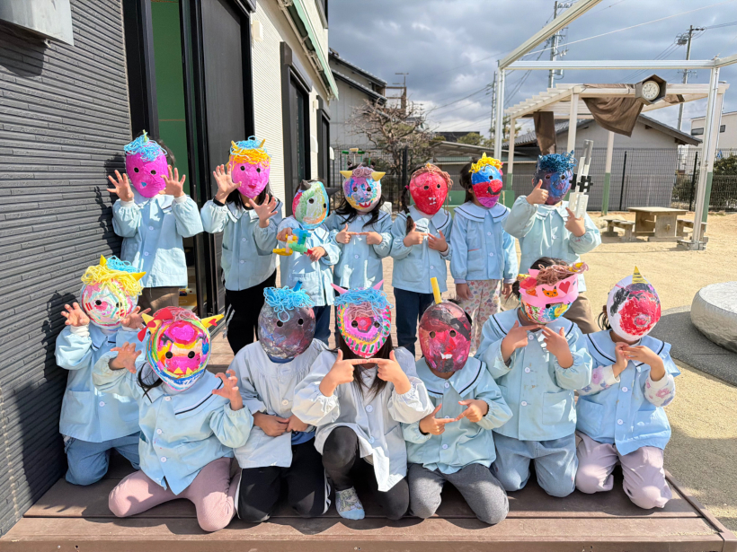 節分製作では、張り子の鬼のお面を作りました。