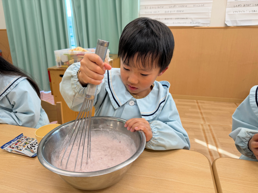 ホイッパーで混ぜどんどん固まっていくと、「なんかかわってきた!」と驚いていました。