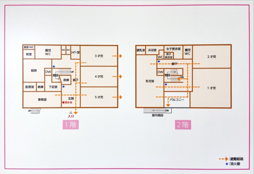 1階に幼児クラスの保育室、給食室があります。2階は、乳児クラスの保育室、バルコニーがあります。