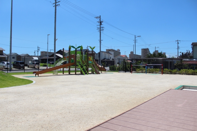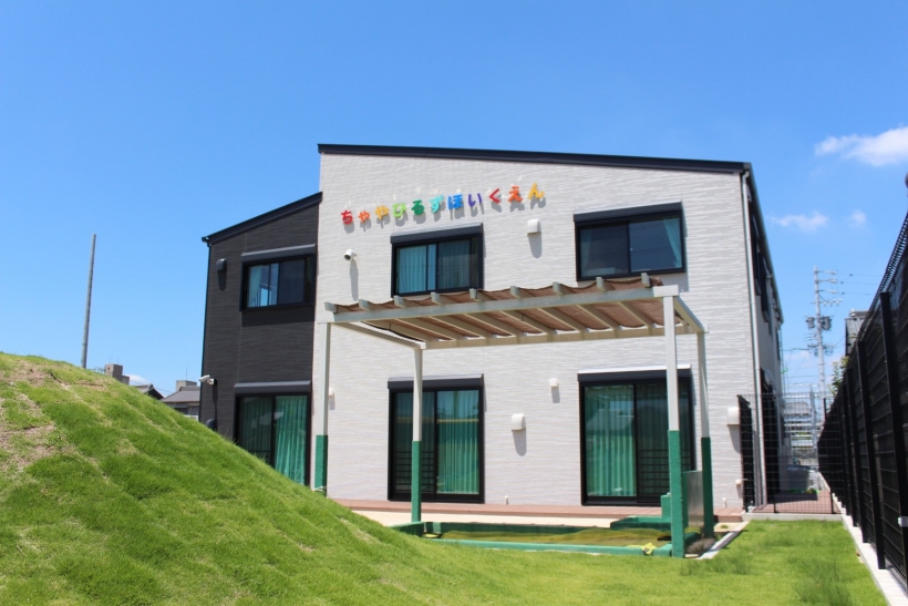 園庭には、ちゃやひるず保育園を象徴する芝生の築山、砂場、鉄棒、恐竜の大型遊具(ローラーすべり台)が設置してあります。